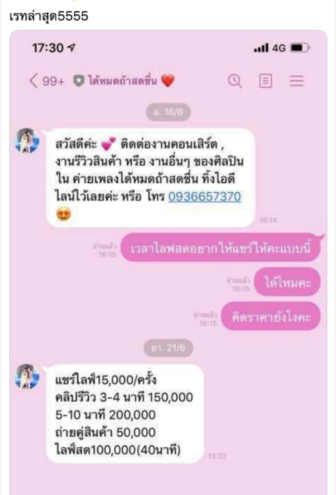 หลังจากนั้น เมื่อช่วงเดือน มิ.ย. ที่ผ่านมา ก็ได้มีคนไปถามถึงเรตราคาอีกว่า ถ้าจะให้ช่วยแชร์ไลฟ์ขายสินค้าคิดราคายังไง ทางทีมงานก็ได้แจ้งราคามาดังนี้