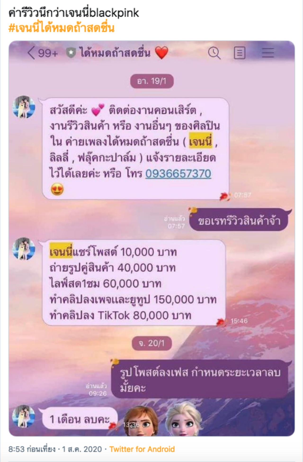 ยังคงตกเป็นประเด็นร้อนที่หลายคนพูดถึงอย่างต่อเนื่องในโลกออนไลน์ สำหรับดราม่าของ เจนนี่ ได้หมดถ้าสดชื่น และล่าสุดชาวเน็ตได้เผยแพร่ข้อความ ซึ่งเป็นบทสนทนาใน LINE Official กับทางค่ายได้หมดถ้าสดชื่น ซึ่งเป็นการทักไลน์ไปสอบถามเรตค่าตัวรีวิวสินค้าของ เจนนี่ ที่มีราคาแรงไม่น้อยเลยทีเดียว