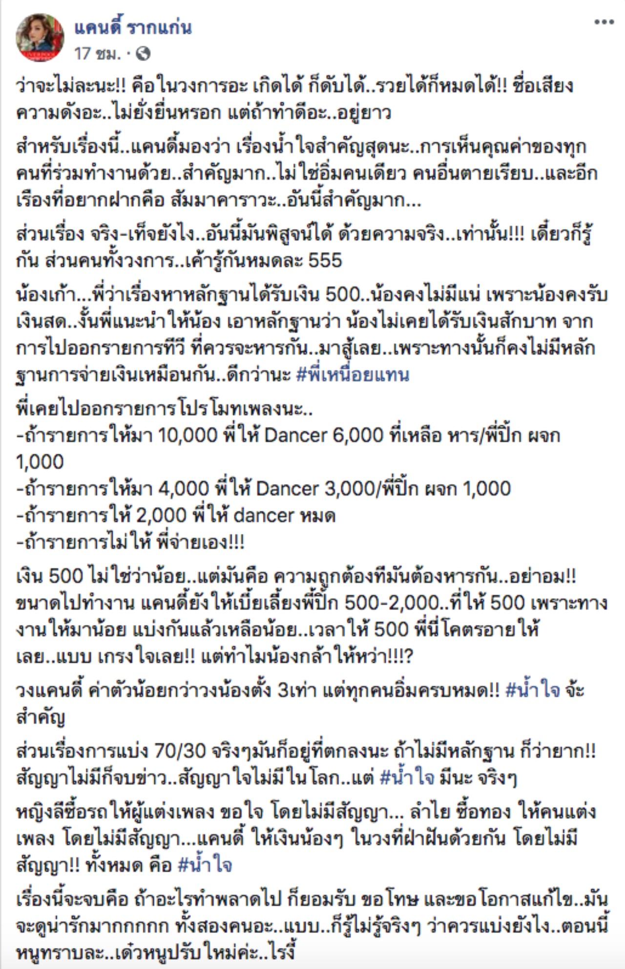 ล่าสุด แคนดี้ รากแก่น ก็ได้ออกมาแสดงความคิดเห็นในฐานะรุ่นพี่ในวงการบันเทิงที่เคยอาบน้ำร้อนมาก่อน พร้อมกับแนะนำน้องๆ ว่า เรื่องน้ำใจสำคัญที่สุด และที่สำคัญควรมีสัมมาคารวะ เพราะในวงการบันเทิงนั้นไม่มีอะไรแน่นอน ดังได้ก็ดับได้