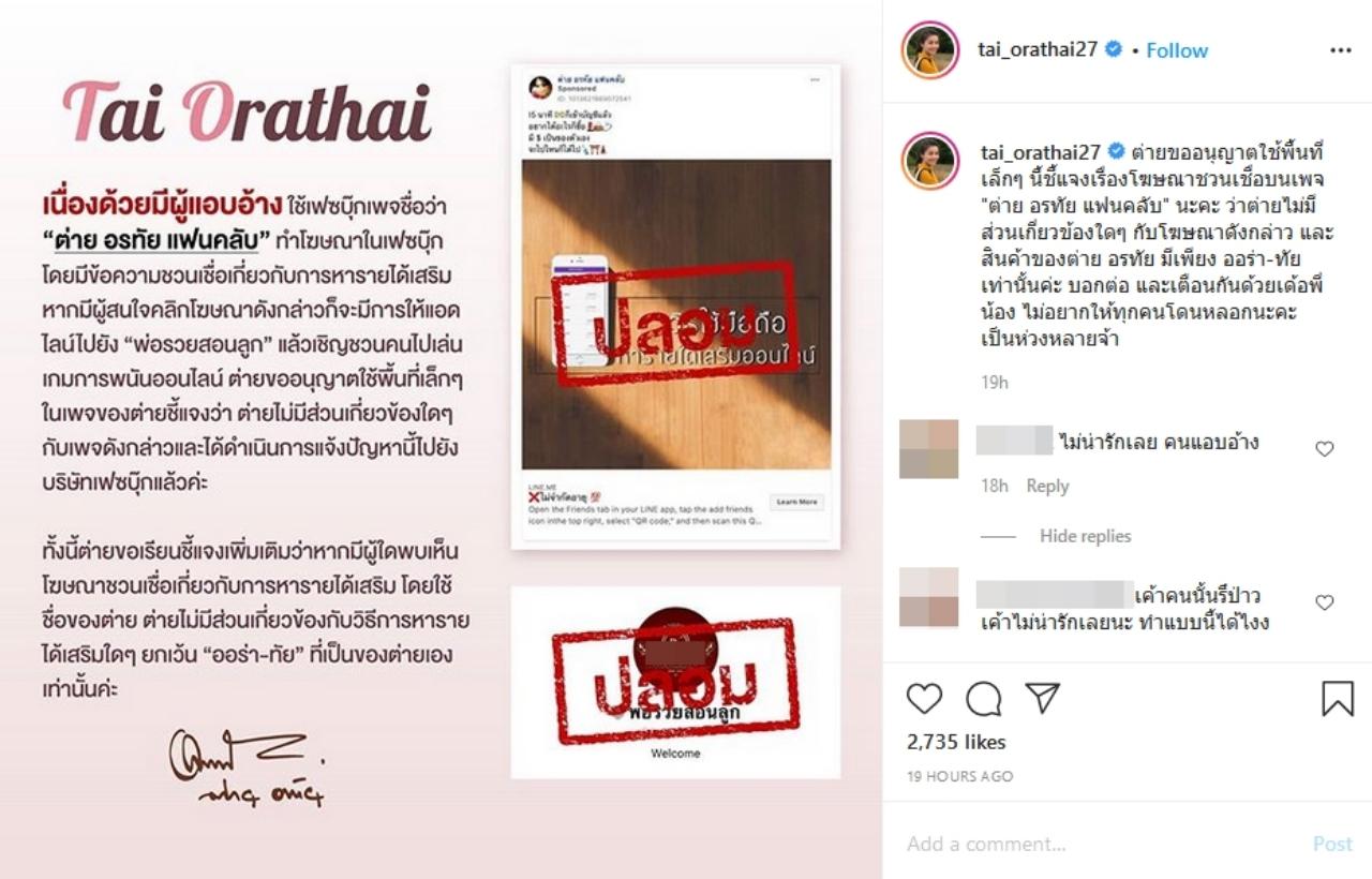 ต่ายขออนุญาตใช้พื้นที่เล็กๆ ในเพจของต่ายชี้แจงว่า ต่ายไม่มีส่วนเกี่ยวข้องใดๆ กับเพจดังกล่าว และได้ดำเนินการแจ้งปัญหานี้ไปยังบริษัทเฟซบุ๊กแล้วค่ะ ทั้งนี้ต่ายขอเรียนชี้แจงเพิ่มเติมว่าหากมีผู้ใดพบเห็นโฆษณาชวนเชื่อเกี่ยวกับการหารายได้เสริม โดยใช้ชื่อของต่าย ต่ายไม่มีส่วนเกี่ยวข้องกับวิธีการหารายได้เสริมใดๆ ยกเว้นออร่า-ทัยที่เป็นของต่ายเองเท่านั้นค่ะ"