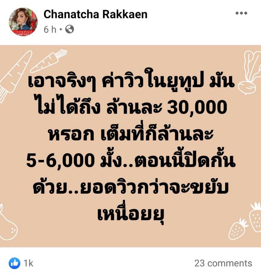 ล่าสุดนักร้องลูกทุ่งสาว แคนดี้ รากแก่น ได้โพสต์ข้อความแสดงความคิดเห็นเกี่ยวกับเรื่องนี้เช่นกัน โดยบอกว่า “เอาจริงๆ ค่าวิวในยูทูบ มันไม่ได้ถึงล้านละ 30,000 หรอก เต็มที่ก็ล้านละ 5-6,000 มั้ง..ตอนนี้ปิดกั้นด้วย..ยอดวิวกว่าจะขยับ เหนื่อยอยู่”