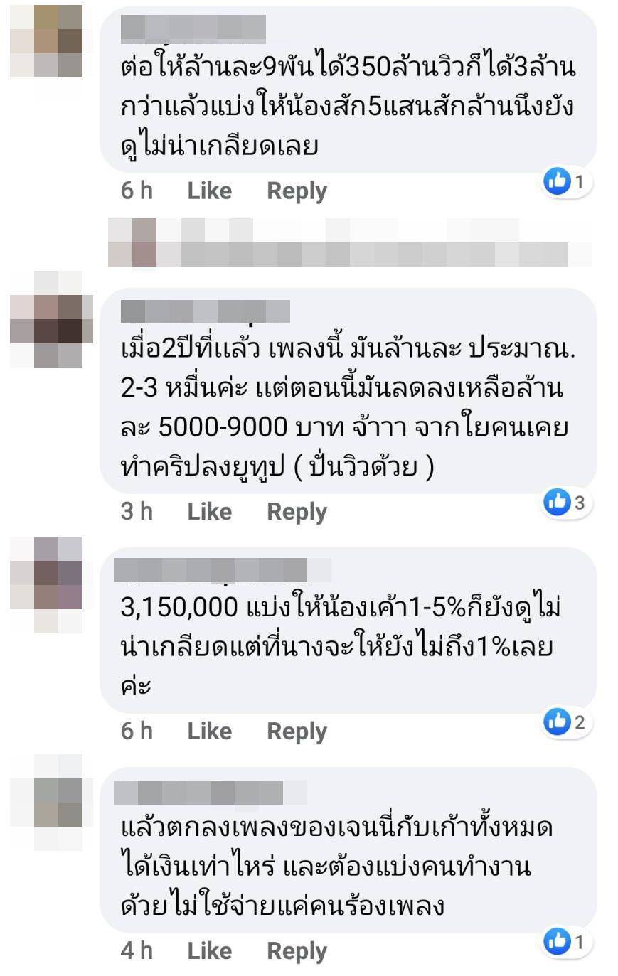 นอกจากนี้ยังมีคนบอกว่า เมื่อ 2 ปีที่เเล้ว เพลงนี้ล้านละประมาณ 2-3 หมื่น แต่ตอนนี้มันลดลงเหลือล้านละ 5,000-9,000 บาท และยังมีบางส่วนวิจารณ์ว่าต่อให้ล้านละ 9 พัน ได้ 350 ล้านวิวก็ได้ 3 ล้านกว่าบาท หากเจนนี่แบ่งให้เก้าสัก 5 แสนหรือล้านนึงยังดูไม่น่าเกลียด ฯลฯ