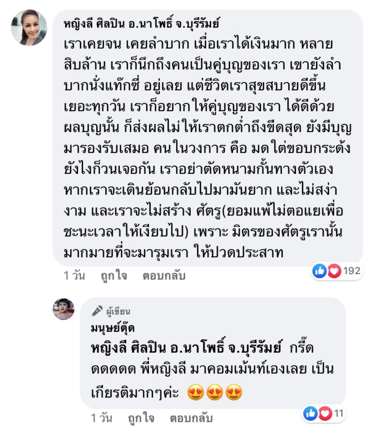 เราก็อยากให้คู่บุญของเราได้ดีด้วย ผลบุญนั้นก็ส่งผลไม่ให้เราตกต่ำถึงขีดสุด ยังมีบุญมารองรับเสมอ คนในวงการคือมดไต่ขอบกระด้งยังไงก็วนเจอกัน เราอย่าตัดหนามกั้นทางตัวเอง หากเราจะเดินย้อนกลับไปมามันยากและไม่สง่างาม และเราจะไม่สร้างศัตรู (ยอมแพ้ไม่ตอแยเพื่อชนะเวลาให้เงียบไป) เพราะมิตรของศัตรูเรานั้นมากมายที่จะมารุมเราให้ปวดประสาท” หลังจากนั้นก็มีชาวเน็ตเข้ามาคอมเมนต์แสดงความคิดเห็นในเรื่องนี้กันอย่างมากมาย และบอกว่า คนที่รู้คุณคนทำอะไรก็เจริญ