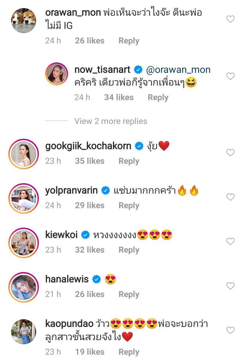 นอกจากนี้คุณแม่ของนาวเข้ามาคอมเมนต์แซวลูกสาวหลังเห็นรูปชุดว่ายน้ำว่า “พ่อเห็นจะว่าไงจ๊ะ ดีนะพ่อไม่มี IG” และนาวตอบกลับว่า “คริคริ เดี๋ยวพ่อก็รู้จากเพื่อนๆ” ด้วย.
