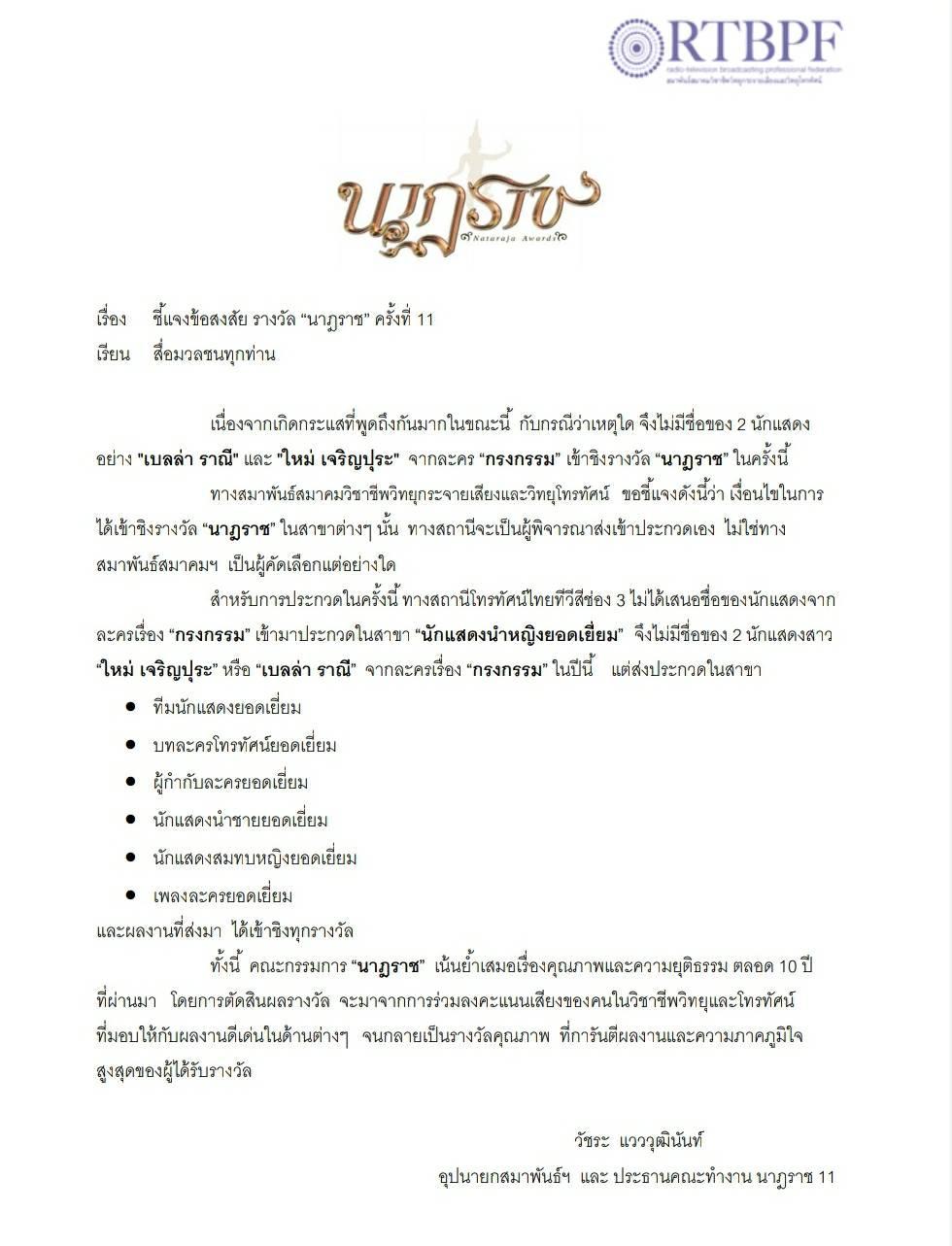 ล่าสุด วัชระ แวววุฒินันท์ อุปนายกสมาพันธ์ฯ และประธานคณะทำงานนาฏราช ครั้งที่ 11 ได้ส่งจดหมายชี้แจงต่อสื่อมวลชนถึงกรณีดังกล่าวไว้ว่า “เนื่องจากเกิดกระแสที่พูดถึงกันมากในขณะนี้ กับกรณีว่าเหตุใด จึงไม่มีชื่อของ 2 นักแสดงอย่าง “เบลล่า ราณี” และ “ใหม่ เจริญปุระ” จากละคร “กรงกรรม” เข้าชิงรางวัล “นาฏราช” ในครั้งนี้