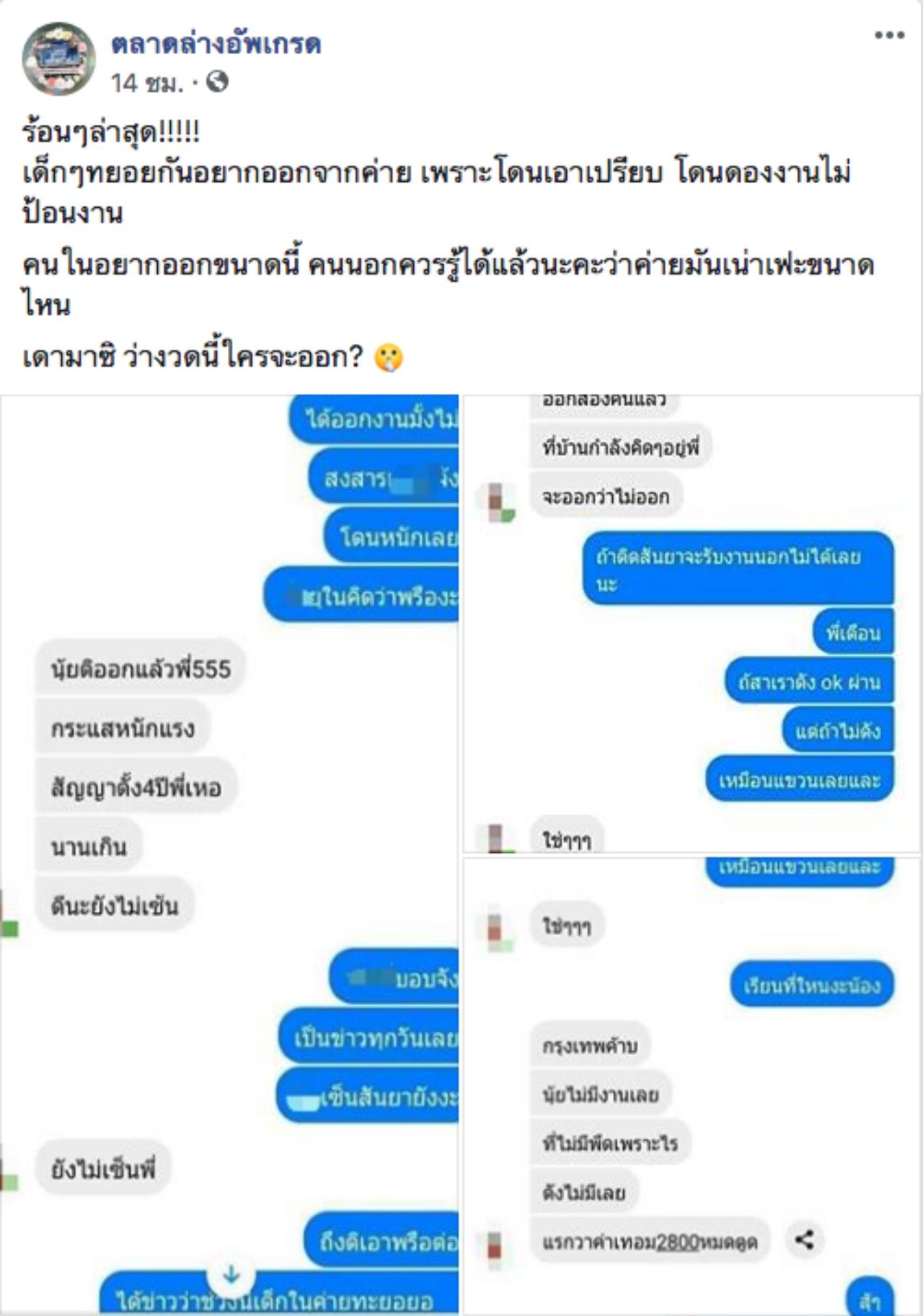 ล่าสุด เพจ ตลาดล่างอัพเกรด ได้โพสต์ข้อความการพูดคุยที่มีคนเอาออกมาแฉว่า ตอนนี้เด็กของทางค่าย ได้หมดถ้าสดชื่น กำลังทยอยออกจากค่ายแล้ว หลังเจอดองงานและโดนเอาเปรียบ อีกต้องให้เซ็นสัญญา 4 ปี