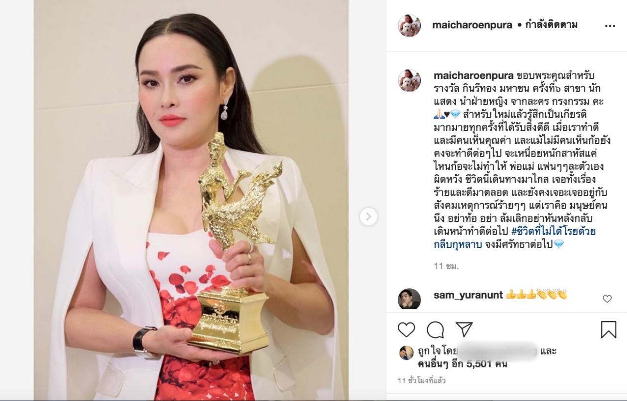 “ขอบพระคุณสำหรับ รางวัล กินรีทอง มหาชน ครั้งที่๖ สาขานักแสดงนำฝ่ายหญิง จากละคร กรงกรรม คะ สำหรับใหม่แล้วรู้สึกเป็นเกียรติมากมายทุกครั้งที่ได้รับสิ่งดีดี เมื่อเราทำดีและมีคนเห็นคุณค่า และแม้ไม่มีคนเห็นก้อยังคงจะทำดีต่อๆไป