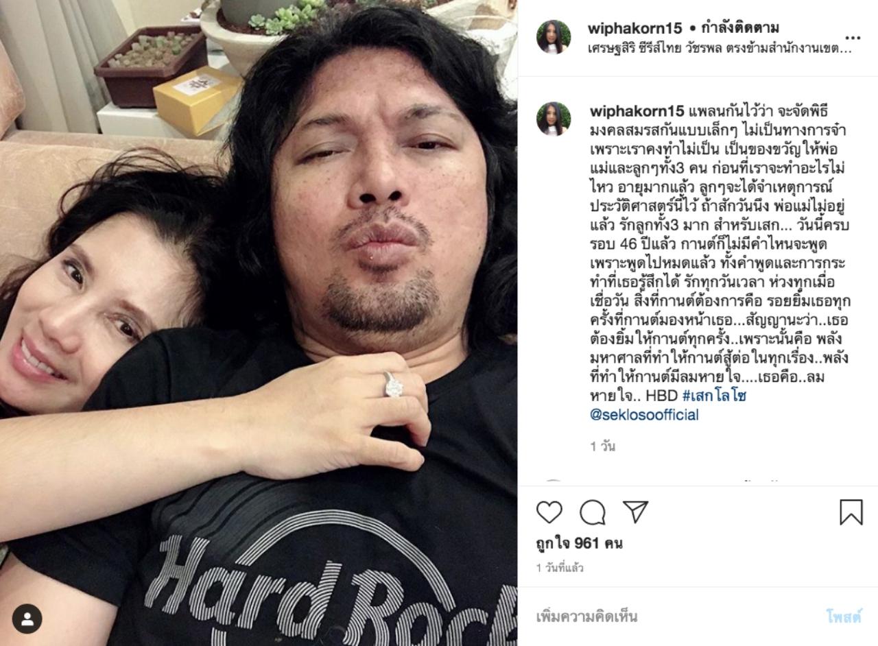 "แพลนกันไว้ว่า จะจัดพิธีมงคลสมรสกันแบบเล็กๆ ไม่เป็นทางการจ๋าเพราะเราคงทำไม่เป็น เป็นของขวัญให้พ่อแม่และลูกๆ ทั้ง 3 คน ก่อนที่เราจะทำอะไรไม่ไหว อายุมากแล้ว ลูกๆ จะได้จำเหตุการณ์ประวัติศาสตร์นี้ไว้ ถ้าสักวันนึง พ่อแม่ไม่อยู่แล้ว รักลูกทั้ง 3 มาก