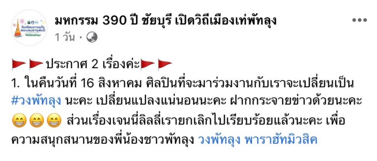 "... ในคืนวันที่ 16 สิงหาคม 2563 ศิลปินที่จะมาร่วมงานจะเปลี่ยนเป็นวงพัทลุง พาราฮัทมิวสิค ส่วนวงของเจนนี่และลิลลี่ ได้หมดถ้าสดชื่น ทางเราได้แจ้งยกเลิกไปเรียบร้อยแล้ว เพื่อความสนุกสนานของพี่น้องชาวพัทลุง ..."