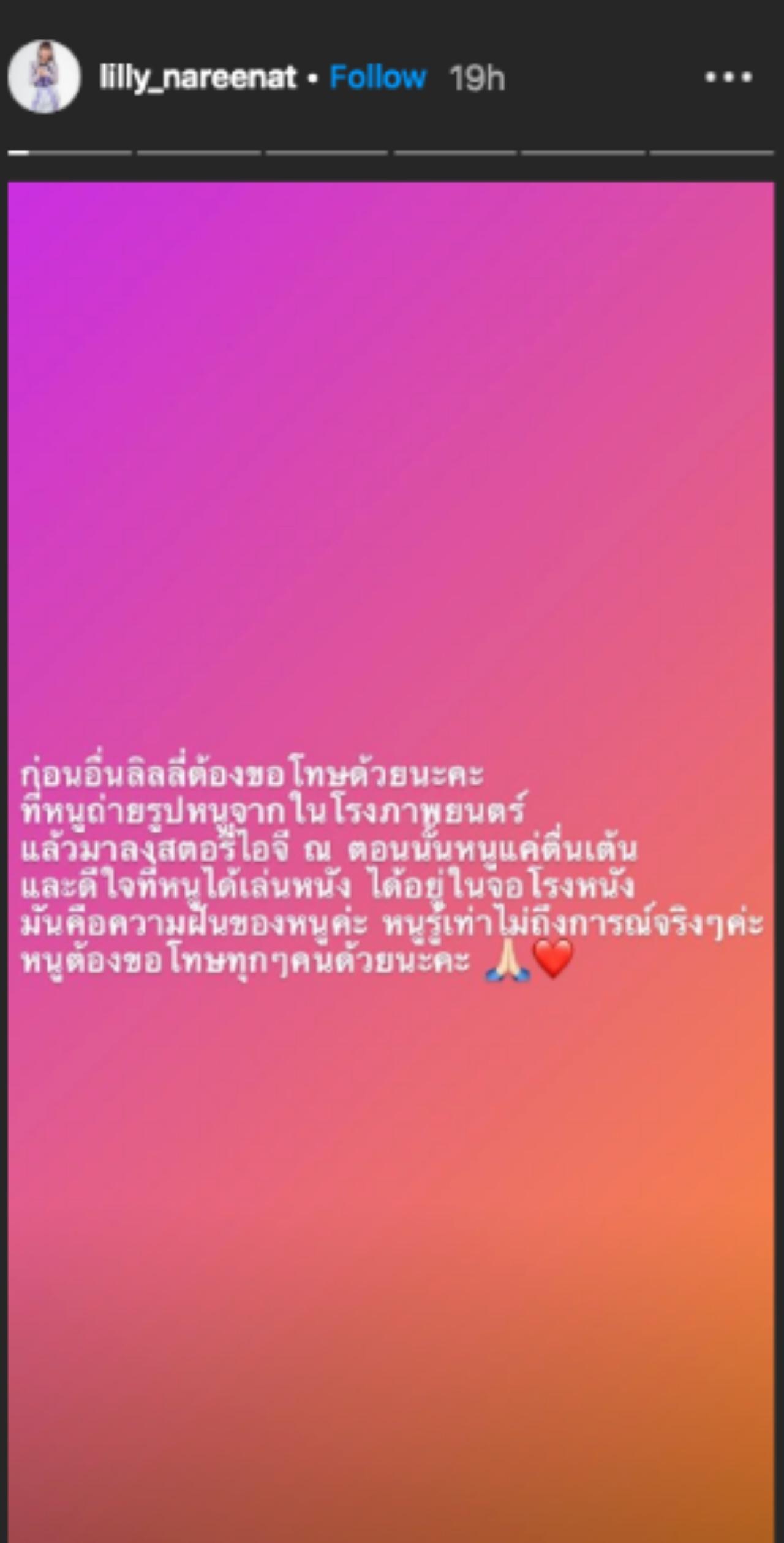 จน ลิลลี่ ต้องออกมาชี้แจงว่า "ก่อนอื่นลิลลี่ต้องขอโทษด้วยนะคะที่หนูถ่ายรูปหนูจากในโรงภาพยนตร์แล้วมาลงสตอรี่ไอจี ณ ตอนนั้นหนูแค่ตื่นเต้นและดีใจที่หนูได้เล่นหนัง ได้อยู่ในจอโรงหนังมันคือความฝันของหนูค่ะ หนูรู้เท่าไม่ถึงการณ์จริงๆ ค่ะ หนูต้องขอโทษทุกๆ คนด้วยนะคะ".