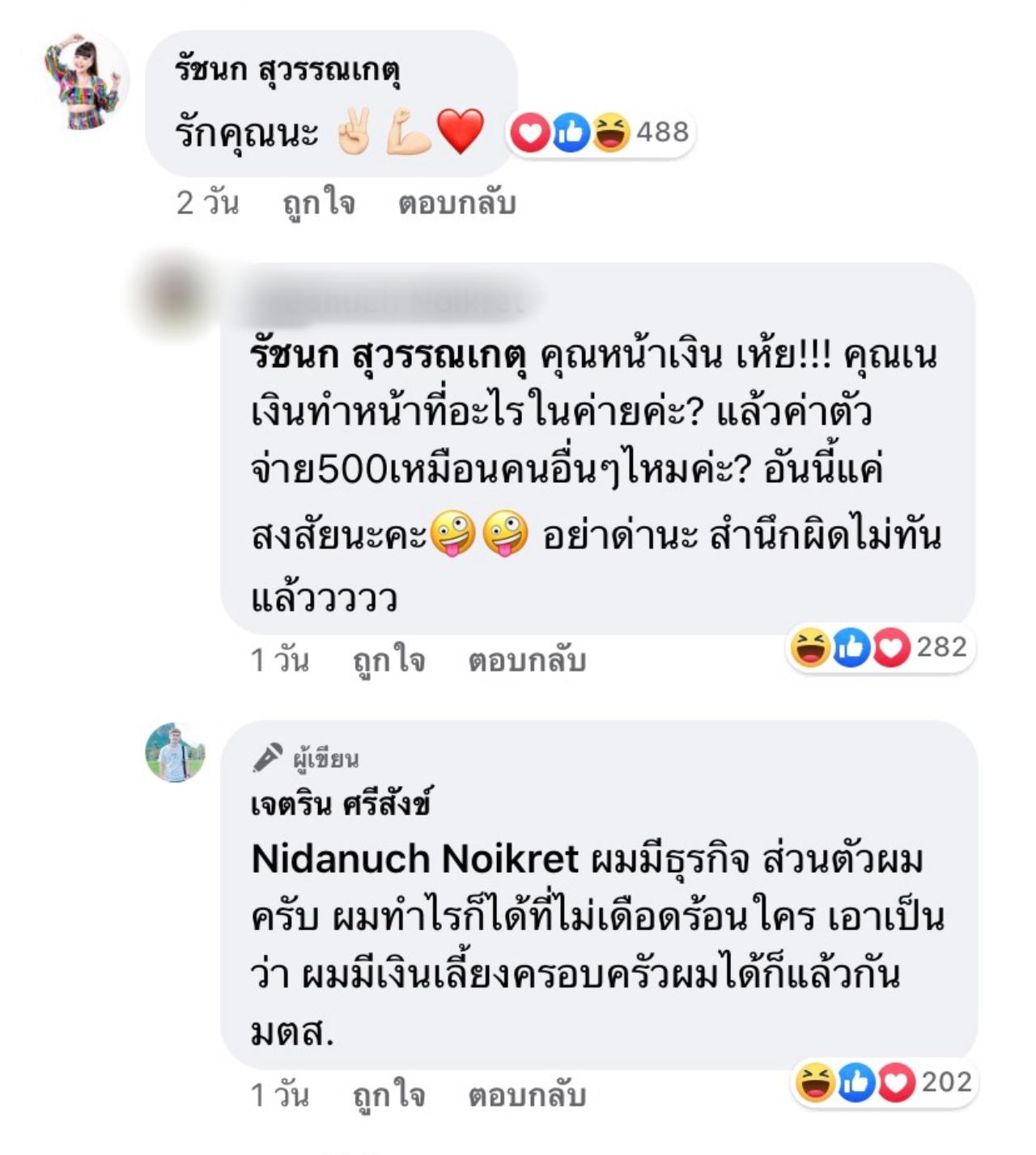 เนเงินทำหน้าที่อะไรในค่าย แล้วได้ค่าตัว 500 เหมือนคนอื่นมั้ย อันนี้แค่สงสัยนะคะ ซึ่งหนุ่มเนเงินก็ได้เข้าไปตอบคอมเมนต์ของชาวเน็ตคนดังกล่าวว่า “ผมมีธุรกิจส่วนตัวผมครับ ผมทำไรก็ได้ที่ไม่เดือดร้อนใคร เอาเป็นว่า ผมมีเงินเลี้ยงครอบครัวผมได้แล้วกัน มตส.”