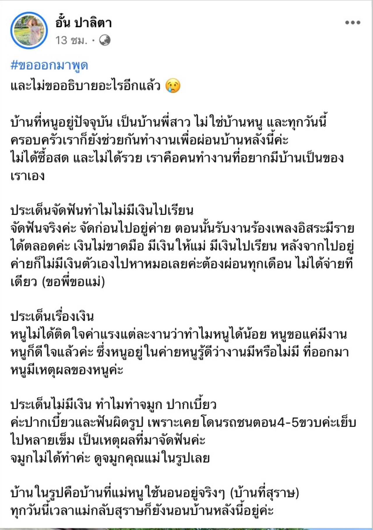 “#ขอออกมาพูด และไม่ขออธิบายอะไรอีกแล้ว บ้านที่หนูอยู่ปัจจุบัน เป็นบ้านพี่สาว ไม่ใช่บ้านหนู และทุกวันนี้ครอบครัวเราก็ยังช่วยกันทำงานเพื่อผ่อนบ้านหลังนี้ค่ะ ไม่ได้ซื้อสด และไม่ได้รวย เราคือคนทำงานที่อยากมีบ้านเป็นของเราเอง