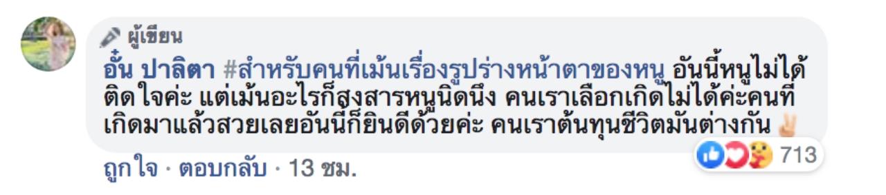 และนอกจากนี้ อั๋น ปาลิตา ยังทิ้งท้ายอีกว่า “#สำหรับคนที่เม้นเรื่องรูปร่างหน้าตาของหนู อันนี้หนูไม่ได้ติดใจค่ะ แต่เม้นอะไรก็สงสารหนูนิดนึง คนเราเลือกเกิดไม่ได้ค่ะ คนที่เกิดมาแล้วสวยเลย อันนี้ก็ยินดีด้วยค่ะ คนเราต้นทุนชีวิตมันต่างกัน”.