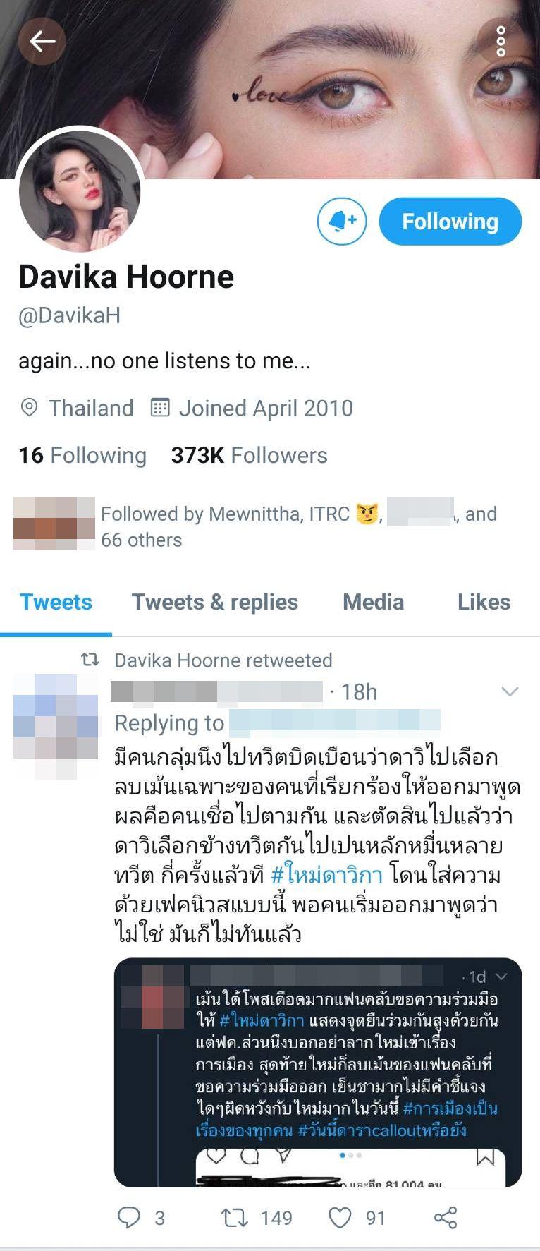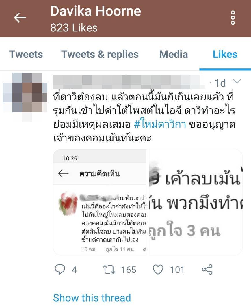 นอกจากนี้ ใหม่ ดาวิกา ยังกดไลค์ข้อความจากแฟนๆ ที่ให้กำลังใจ และออกโรงชี้แจงแทนใหม่ว่า จริงๆ แล้วใหม่ลบเพียงสองคอมเมนต์เนื่องจากทั้ง 2 คอมเมนต์มีการโต้ตอบกันอย่างดุเดือด จึงตัดสินใจลบไป บางคนไม่ทันเห็นคอมเมนต์ด้วยซ้ำแต่คาดเดากันไปเอง และใหม่ก็ได้รีทวีตข้อความจากแฟนคลับคนหนึ่งที่บอกว่ากี่ครั้งแล้วที่ใหม่โดนใส่ความด้วยเฟกนิวส์แบบนี้ พอคนเริ่มมาพูดว่าไม่ใช่ มันก็ไม่ทันแล้ว.