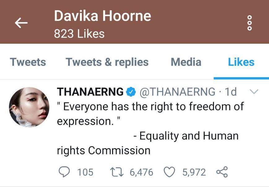แม้จนถึงตอนนี้ ใหม่ ดาวิกา ไม่ได้ชี้แจงอะไร แต่ล่าสุดในทวิตเตอร์มีการแชร์ภาพทวิตเตอร์ของใหม่ที่กดไลค์ข้อความในทวิตเตอร์ของนักแสดงรุ่นน้องอย่าง ต้าเหนิง กัญญาวีร์ สองเมือง ที่ทวีตเกี่ยวกับสิทธิเสรีภาพในการแสดงความคิดเห็นว่า “Everyone has the right to freedom of expression. - Equality and Human rights Commission”