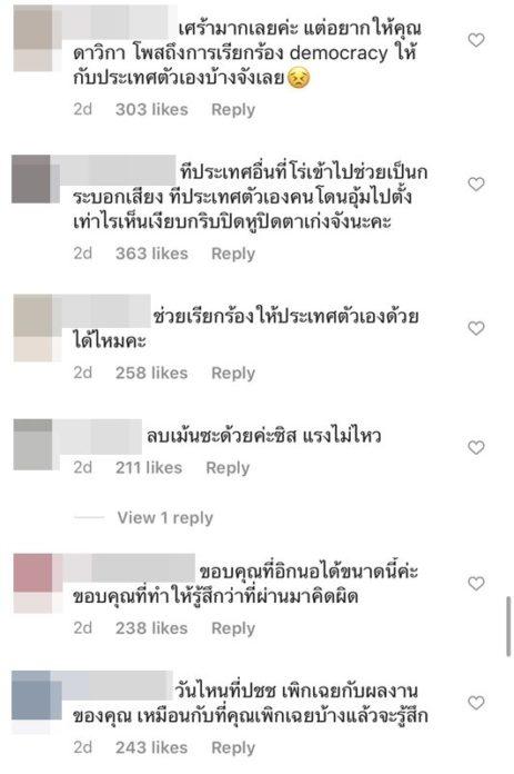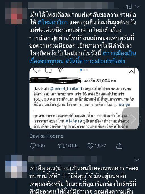 และเหตุผลที่ชาวเน็ตเรียกร้อง เป็นเพราะว่า ใหม่ ดาวิกา ทำงานให้กับยูนิเซฟ ซึ่งเป็นองค์กรที่ช่วยเหลือเพื่อนมนุษย์เช่นกัน แต่ก็มีแฟนคลับของใหม่หลายคนที่ขอร้องอย่าดึงใหม่เข้ามาอยู่ในเรื่องการเมือง ซึ่งหลังจากนั้นมีกระแสว่าใหม่ลบคอมเมนต์เกี่ยวกับการเมืองทิ้งไป ทำให้ชาวเน็ตหลายคนไม่พอใจอย่างมาก จนทำให้เกิดการวิพากษ์วิจารณ์หนัก
