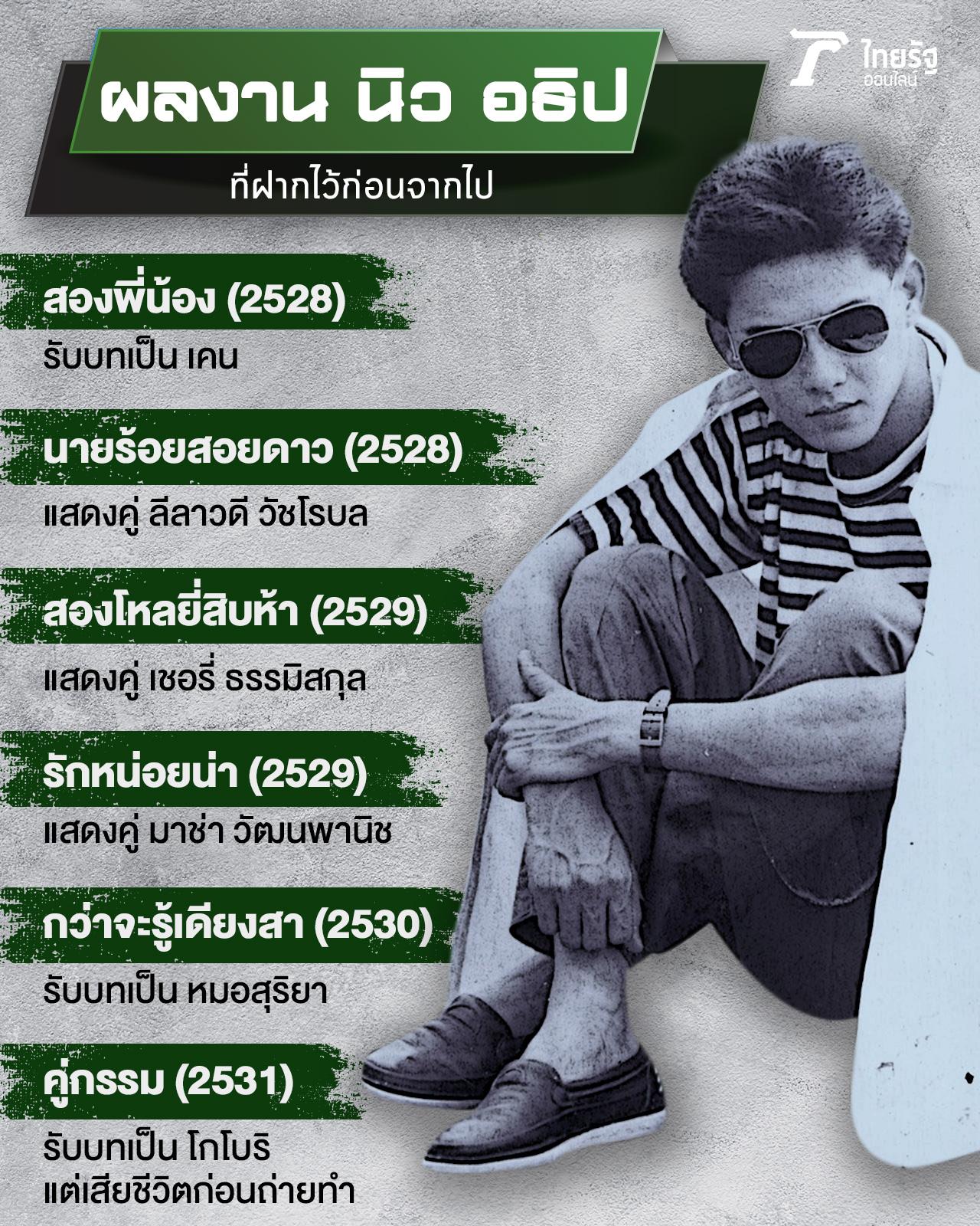 แต่ยังไม่ทันจะได้ฉายแสงเจิดจรัสอย่างเต็มที่ นิว อธิป ก็ต้องจากไปด้วยอุบัติเหตุทางรถยนต์ เมื่อวันที่ 1 ต.ค. 2530 ด้วยวัยเพียง 22 ปีเท่านั้น ซึ่งข่าวการจากไปอย่างกะทันหันของ นิว อธิป นั้น สร้างความช็อกและเสียใจให้กับเหล่าบรรดาแฟนๆ และครอบครัวของพระเอกหนุ่มเป็นอย่างมาก