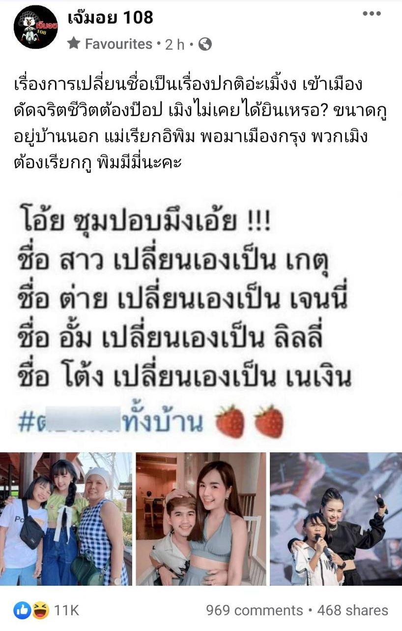 ล่าสุดเพจบันเทิงดัง เจ๊มอย 108 โพสต์ภาพข้อความที่เขียนว่า “โอ๊ย ซุมปอบมึ_เอ๊ย ชื่อ สาว เปลี่ยนเองเป็น เกตุ ชื่อ ต่าย เปลี่ยนเองเป็น เจนนี่ ชื่อ อั้ม เปลี่ยนเองเป็น ลิลลี่ ชื่อ โต้ง เปลี่ยนเองเป็น เนเงิน #ตอแ_ลทั้งบ้าน” และเขียนข้อความว่า “เรื่องการเปลี่ยนชื่อเป็นเรื่องปกติอ่ะเมิ้งง เข้าเมืองดัดจริตชีวิตต้องป๊อป เมิงไม่เคยได้ยินเหรอ? ขนาดกูอยู่บ้านนอก แม่เรียกอิพิม พอมาเมืองกรุง พวกเมิงต้องเรียกกู พิมมีมี่นะคะ”
