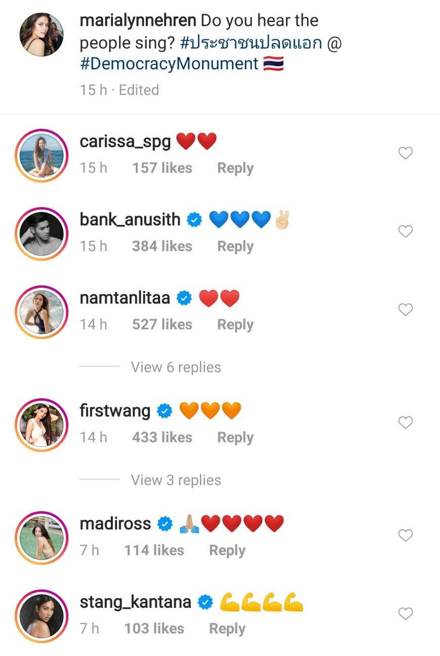 เป็นอีกหนึ่งคนที่แสดงจุดยืนเรื่องการเมืองแบบชัดเจน สำหรับ มารีญา พูลเลิศลาภ มิสยูนิเวิร์สไทยแลนด์ 2017 ซึ่งก่อนหน้านี้นางงามสาวก็ได้โพสต์แสดงความคิดเห็นว่าไม่สนับสนุนเผด็จการ พร้อมทั้งสนับสนุนการแสดงจุดยืนเรื่องการเมืองของเหล่านักศึกษาจากสถาบันต่างๆ