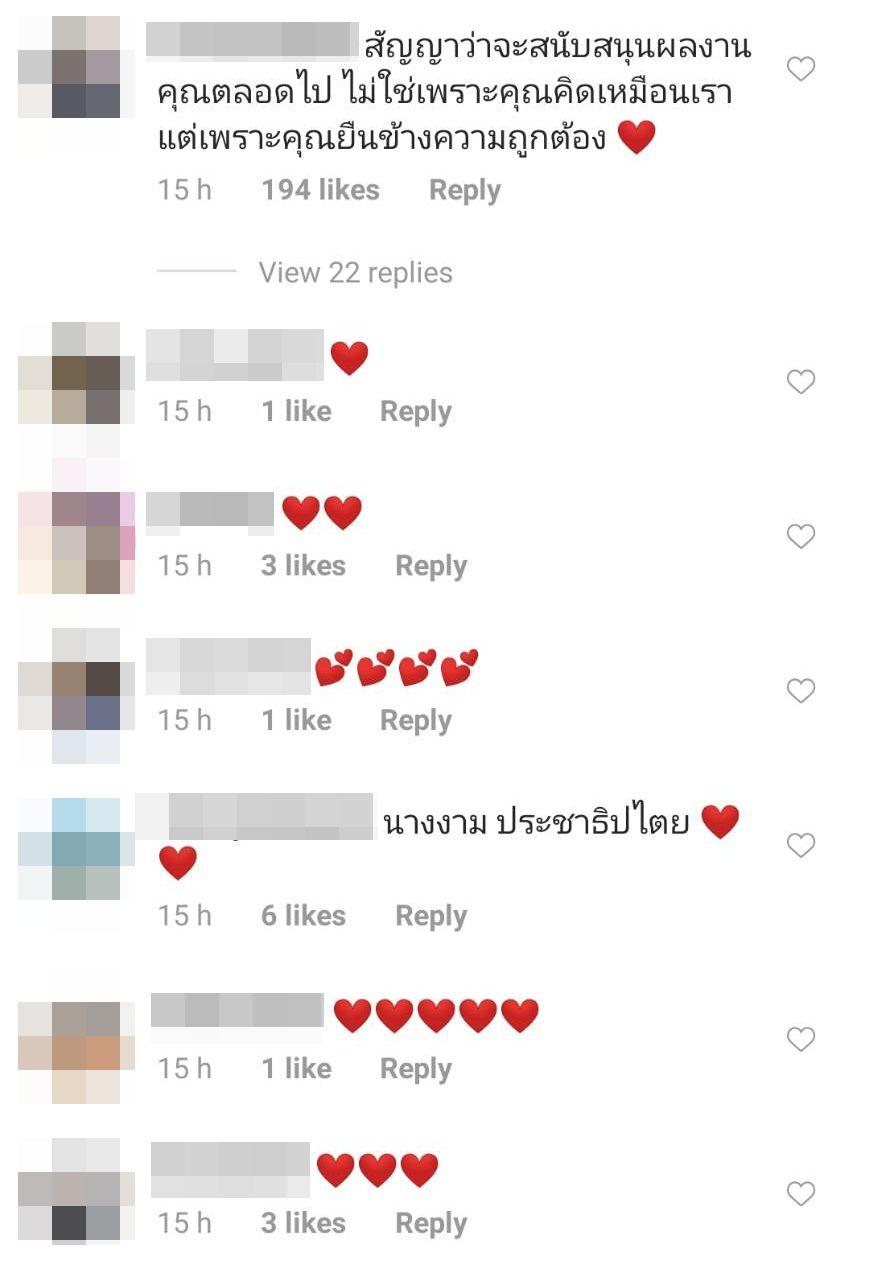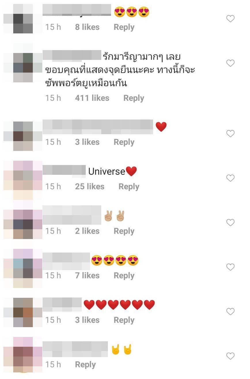 ซึ่งหลังจากที่มารีญาโพสต์ภาพและข้อความดังกล่าวก็มีชาวเน็ตเข้ามาคอมเมนต์บอกรักมารีญา ขอบคุณที่แสดงจุดยืน และบอกว่าจะสนับสนุนผลงานของมารีญาตลอดไป ไม่ใช่เพราะว่าคิดเหมือนกัน แต่เป็นเพราะยืนข้างความถูกต้อง รวมไปถึงคนในวงการบันเทิงและวงการนางงามที่ให้กำลังใจ อาทิ คารีสา สปริงเก็ตต์, แบงค์ อนุสิทธิ, น้ำตาล ชลิตา, เฟิร์ส ภัทราพร หวัง, มาร์ดี้ เมดิสัน รอส, สตางค์ ดิษย์ลดา ฯลฯ