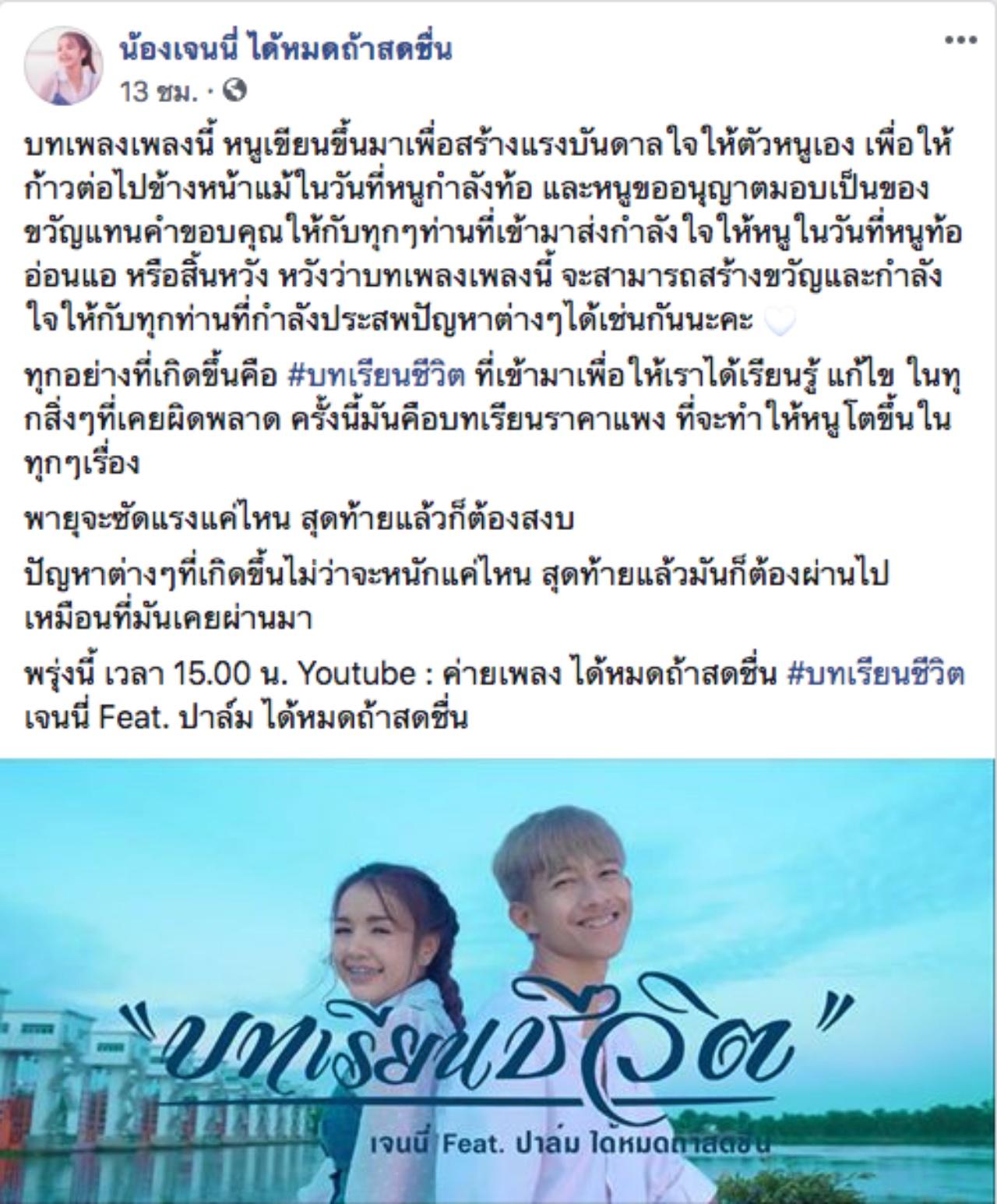 เรียกได้ว่าช่วงนี้ยังคงเจอดราม่าไม่หยุด สำหรับ เจนนี่ ได้หมดถ้าสดชื่น ไม่ว่าจะทำอะไรก็กลายเป็นที่ถูกจับตามองของชาวโซเชียลอยู่เรื่อยๆ ล่าสุด เจนนี่ ได้เปิดตัวเพลงใหม่ "บทเรียนชีวิต" ที่ร้องกับนักร้องในค่าย ปาล์ม ได้หมดถ้าสดชื่น