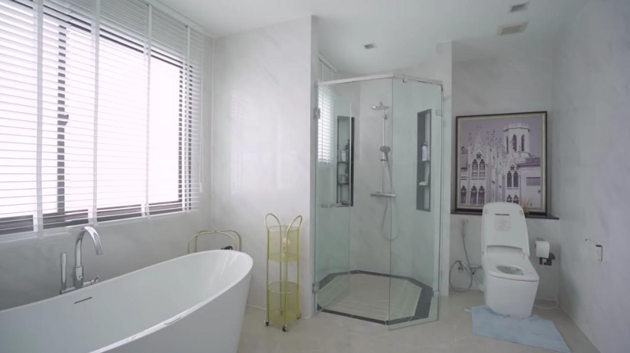 โดย ใบเตย บอกว่า บ้านหลังนี้มีพื้นที่กว้างกว่าทุกหลังในหมู่บ้าน ประมาณ 130 ตร.ว. และมีพื้นที่ใช้สอยในบ้านประมาณ 545 ตร.ม. ได้ดูบ้านมาหลายหลัง เคยสร้างบ้านเองมาก่อน เจอปัญหามาเยอะมาก เลยเลือกซื้อบ้านแบบพร้อมอยู่ดีกว่า บ้านหลังเก่าที่เคยซื้อไม่ได้ดูฮวงจุ้ยอะไรเลย แต่บ้านหลังนี้ดูมาหมดแล้ว อีกทั้งยังมีฟังก์ชันที่เอื้ออำนวยต่อผู้สูงอายุด้วย เช่น ทางลาดบริเวณหน้าประตู ไว้สำหรับใช้วีลแชร์หรือรถเข็นเด็ก แถมพื้นที่ในบ้านก็กว้างขวางเหมาะสำหรับการพักอาศัยแบบครอบครัว