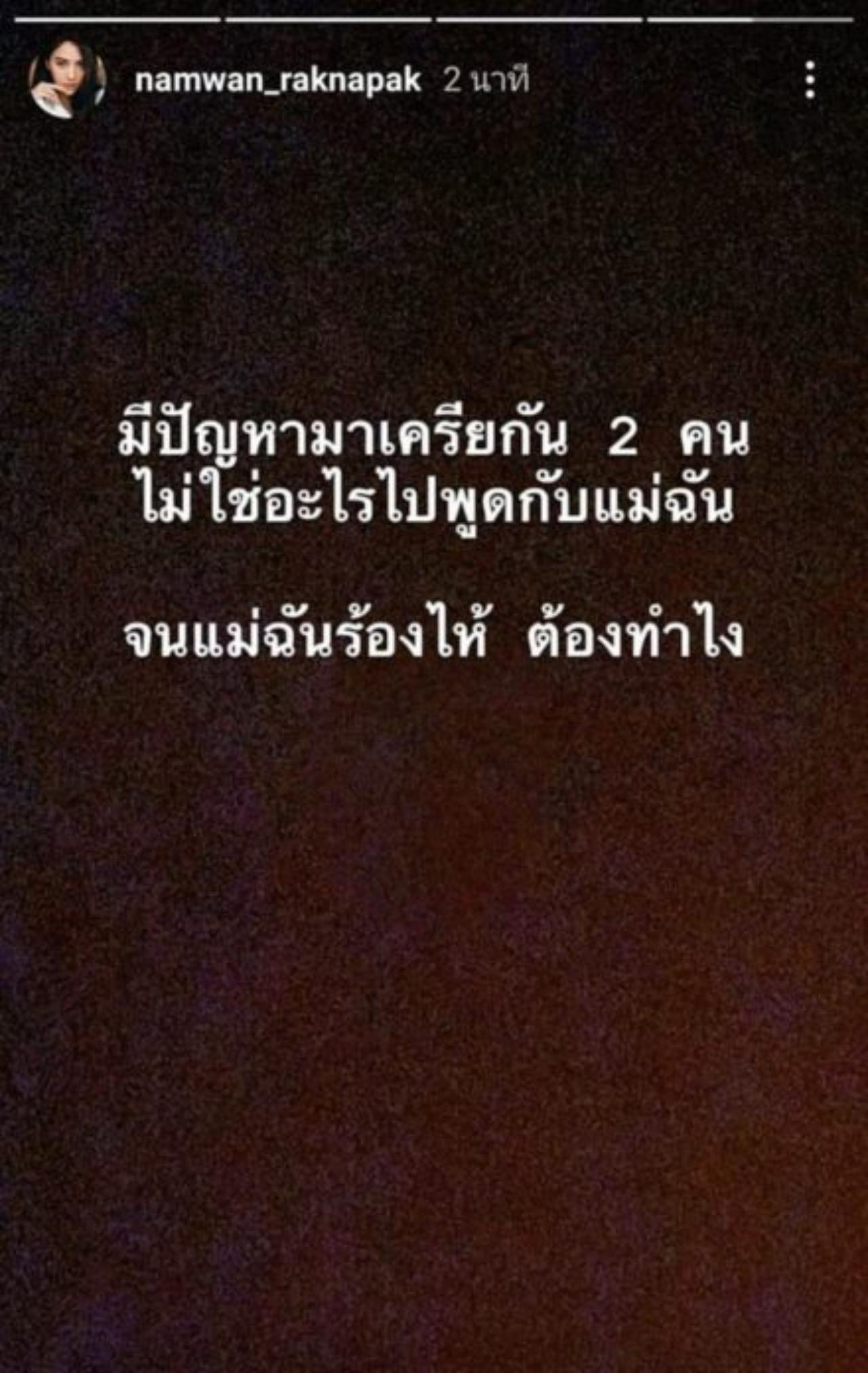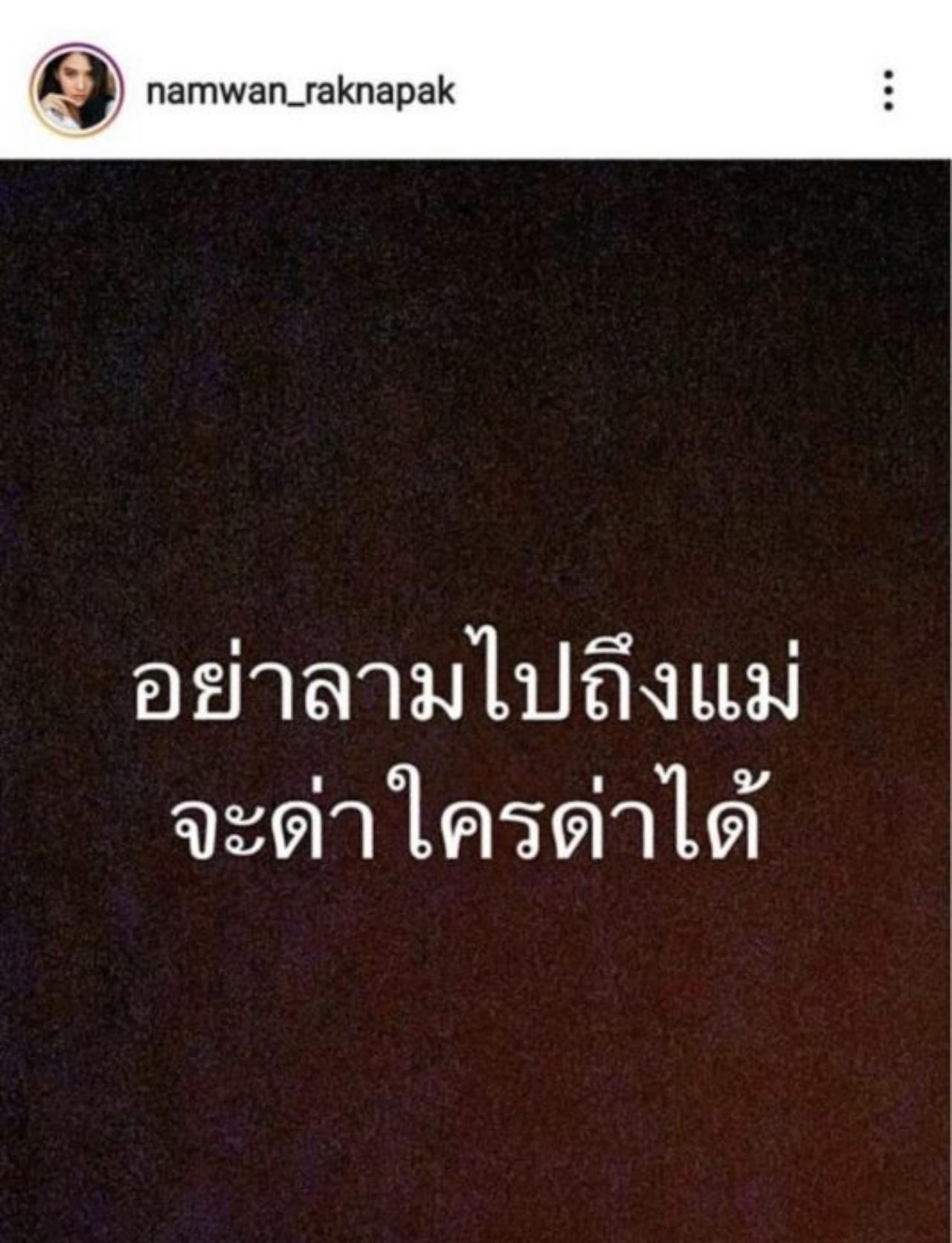ล่าสุด น้ำหวาน เดอะเฟซ ได้ออกมาโพสต์ข้อความว่าลงในอินสตาแกรมของตัวเอง “อย่าลามไปถึงแม่ จะด่าใครด่าได้” พร้อมกับขึ้นไอจีสตอรี่ว่า “มีปัญหามาเครียกัน 2 คน ไม่ใช่อะไรไปพูดกับแม่ฉัน จนแม่ฉันร้องไห้ ต้องทำไง”