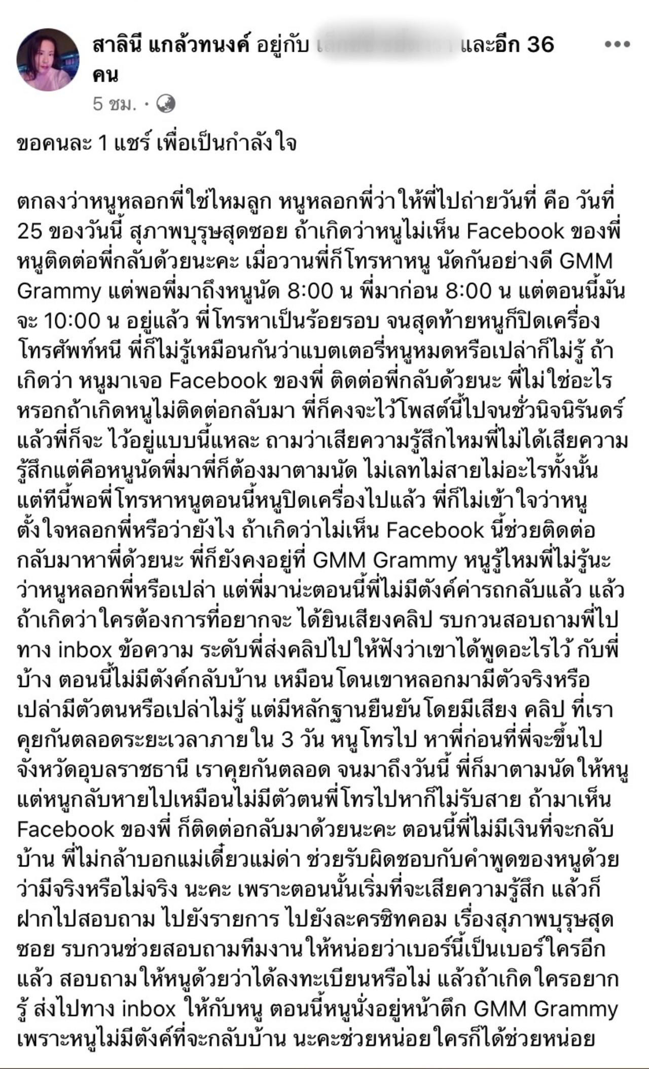 ถ้าเกิดว่าไม่เห็น Facebook นี้ช่วยติดต่อกลับมาหาพี่ด้วยนะ พี่ก็ยังคงอยู่ที่ GMM Grammy หนูรู้ไหมพี่ไม่รู้นะว่าหนูหลอกพี่หรือเปล่า แต่พี่มาน่ะตอนนี้พี่ไม่มีตังค์ค่ารถกลับแล้ว แล้วถ้าเกิดว่าใครต้องการที่อยากจะได้ยินเสียงคลิป รบกวนสอบถามพี่ไปทาง inbox ข้อความ