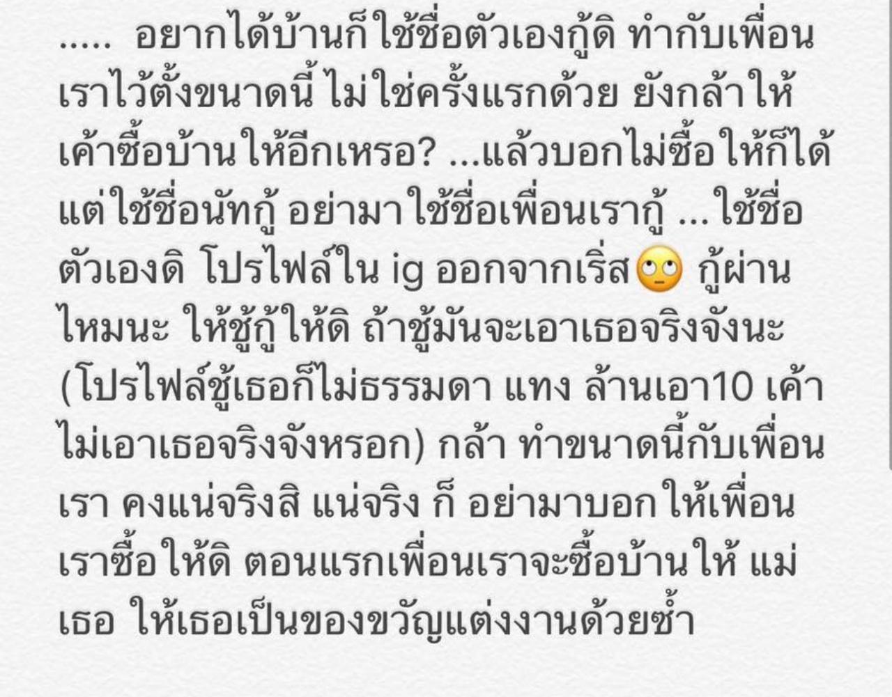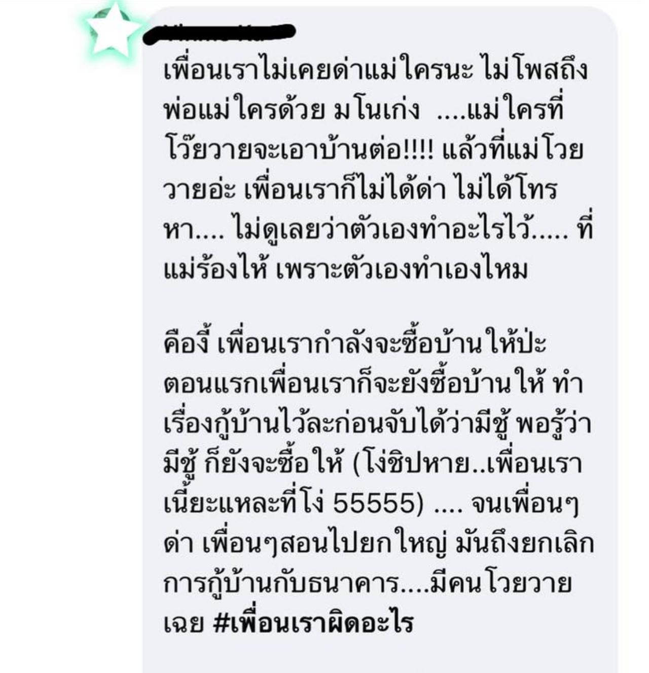 เพื่อนของตนนั้นไม่เคยด่าแม่ใคร ไม่เคยโทรหา แต่แม่ใครที่โวยวายจะเอาบ้าน ไม่ดูเลยว่าตัวเองทำอะไรไว้ ที่แม่ร้องไห้เป็นเพราะตัวเอง ตอนแรกเพื่อนจะซื้อบ้านให้ก่อนจะจับได้ว่ามีชู้ พอรู้ว่ามีก็ยังจะซื้อให้ แต่เพื่อนๆ ด่า เลยยกเลิกการกู้บ้านกับธนาคาร เลยมีคนโวยวาย กล้าทำขนาดนี้ยังกล้าของให้เขาซื้อบ้านให้ ใช้ชื่อตัวเองกู้สิ บ้านหลังนี้เพื่อนตนเองตั้งใจซื้อให้เป็นของขวัญวันแต่งงานด้วยซ้ำ