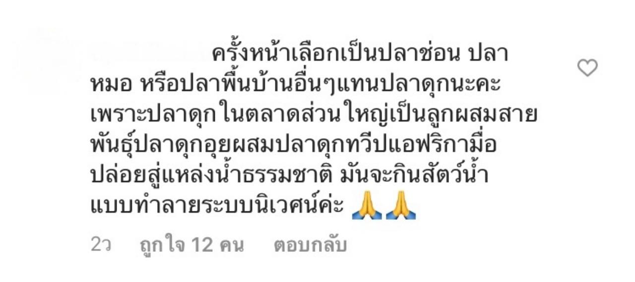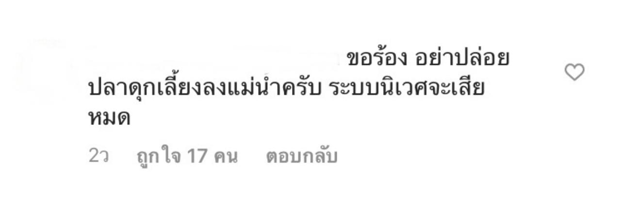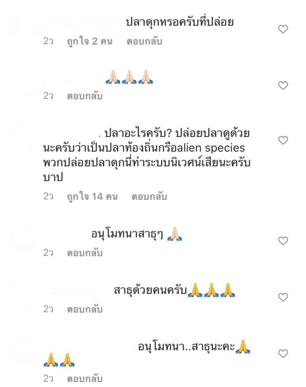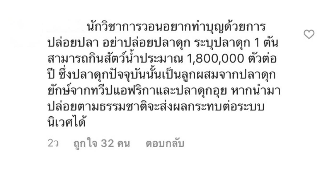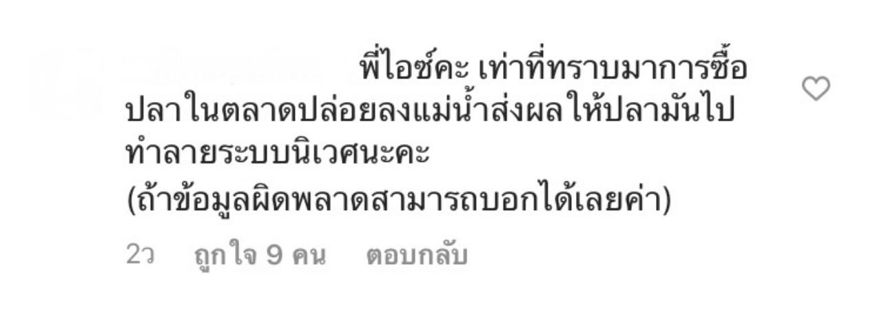 และยังมีบางส่วนที่เข้ามาติง เพราะสังเกตเห็นว่าปลาที่ไอซ์ได้ปล่อยนั้นเป็นปลาดุก เลยได้คอมเมนต์เตือนว่า อาจทำให้ระบบนิเวศเสียได้ เพราะปลาดุกจะไปกินปลาตัวอื่น.