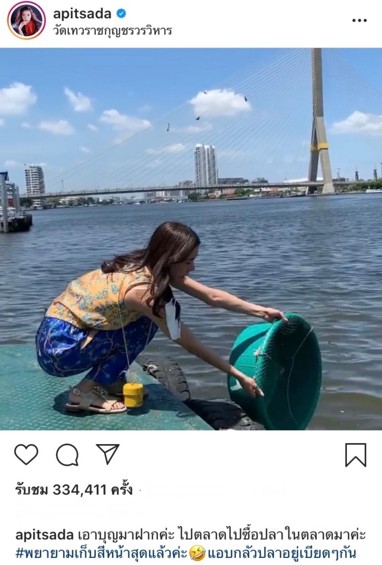 "เอาบุญมาฝากค่ะ ไปตลาดไปซื้อปลาในตลาดมาค่ะ #พยายามเก็บสีหน้าสุดแล้วค่ะ แอบกลัวปลาอยู่เบียดๆ กัน" ซึ่งแฟนๆ ที่ติดตามต่างก็เข้ามาคอมเมนต์ขออนุโมทนาสาธุบุญกันเป็นจำนวนมาก