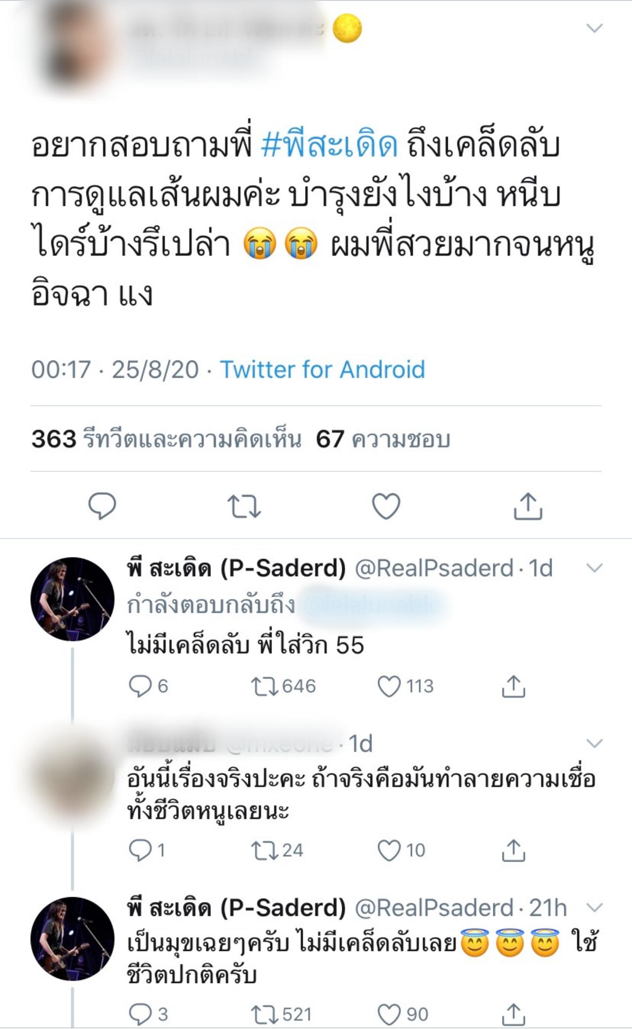 ซึ่งนักร้องหนุ่มก็ได้มาทวิตตอบคำถามดังกล่าวว่า “ไม่มีเคล็ดลับ พี่ใส่วิก 55” หลังจากที่ตอบคำถามไป ก็ทำเอาหลายคนเชื่อว่า นักร้องหนุ่ม พี สะเดิด นั้นใส่วิกผม งานนี้ร้อนถึงเจ้าตัวต้องออกมาชี้แจงอย่างด่วนจี๋ว่า “เป็นมุกเฉยๆ ครับ ไม่มีเคล็ดลับเลย ใช้ชีวิตปกติครับ”