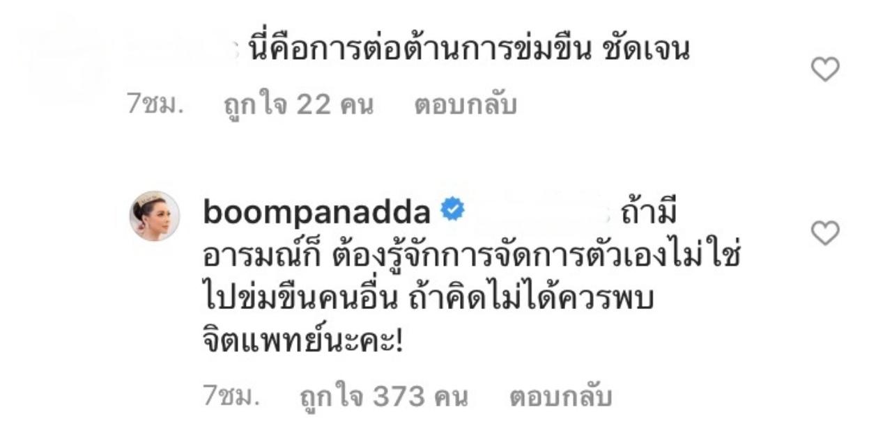 แต่งานนี้กลับเจอดราม่าซะงั้น เมื่อมีคนเข้ามาคอมเมนต์วิจารณ์ใต้ภาพว่า "นี่คือการต่อต้านการข่มขืน ชัดเจน" และ บุ๋ม ก็ได้เข้ามาตอบกลับอย่างชัดเจนว่า "ถ้ามีอารมณ์ก็ต้องรู้จักการจัดการตัวเองไม่ใช่ไปข่มขืนคนอื่น ถ้าคิดไม่ได้ควรพบจิตแพทย์นะคะ!"
