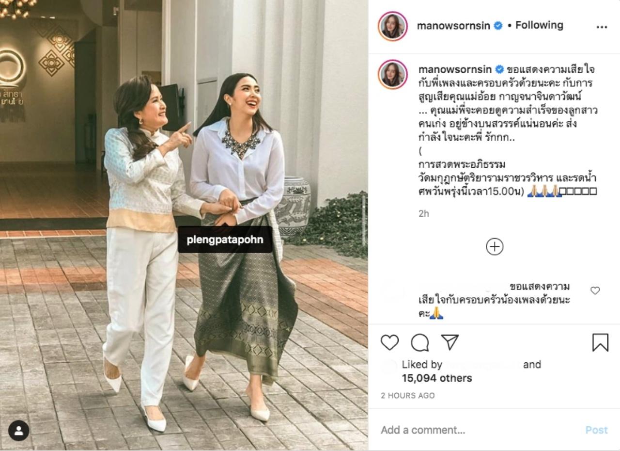 "ขอแสดงความเสียใจกับพี่เพลงและครอบครัวด้วยนะคะ กับการสูญเสียคุณแม่อ้อย กาญจนา จินดาวัฒน์ คุณแม่พี่จะคอยดูความสำเร็จของลูกสาวคนเก่ง อยู่ข้างบนสวรรค์แน่นอนค่ะ ส่งกำลังใจนะคะพี่ รักกก