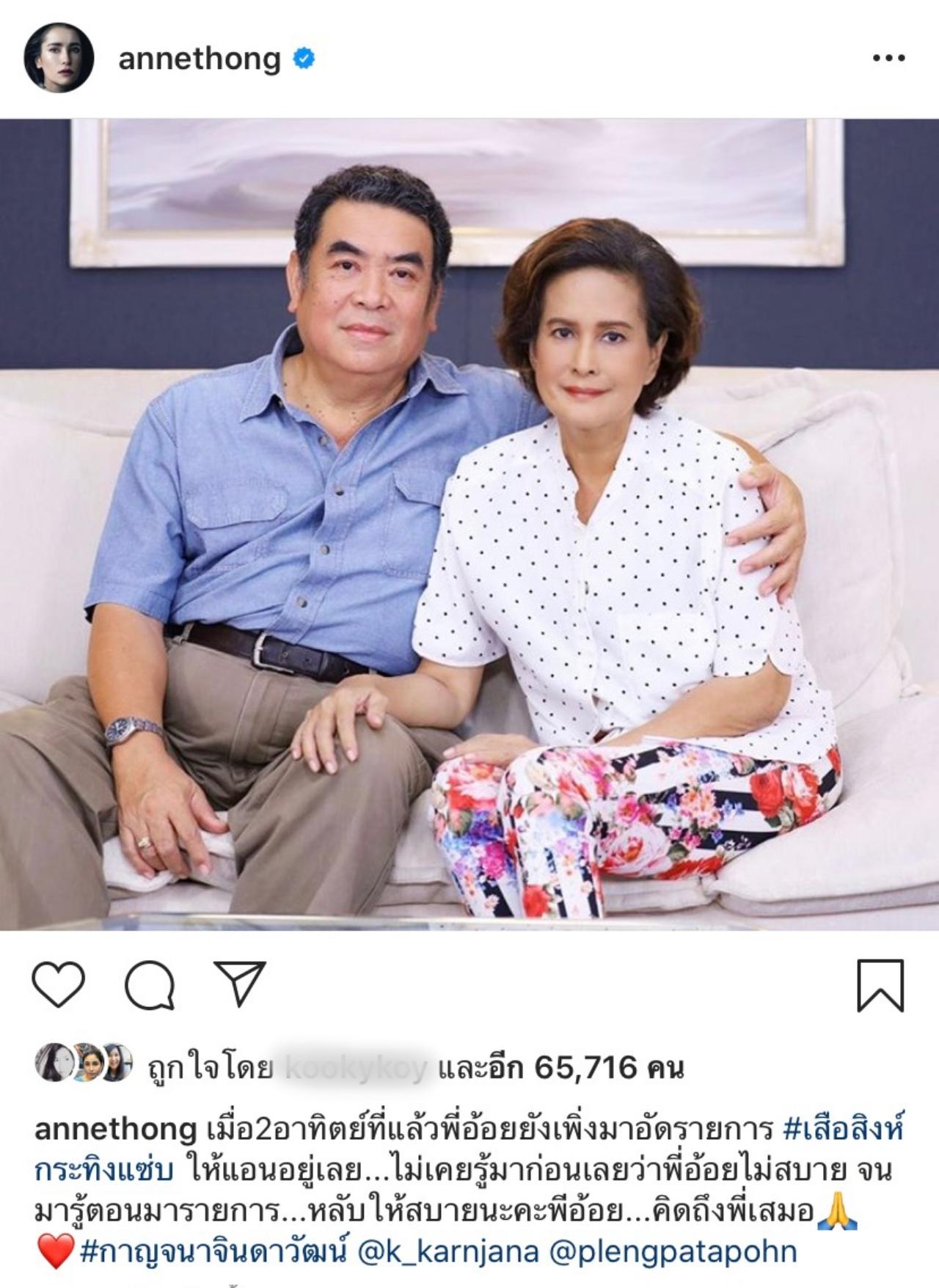 ซึ่ง แอน ทองประสม ได้โพสต์ข้อความผ่านทางอินสตาแกรมส่วนตัวของตัวเอง โดยเป็นรูปคู่ของ อ้อย กาญจนา และสามี พร้อมกับข้อความว่า “เมื่อ 2 อาทิตย์ที่แล้วพี่อ้อยยังเพิ่งมาอัดรายการ #เสือสิงห์กระทิงแซ่บ ให้แอนอยู่เลย...ไม่เคยรู้มาก่อนเลยว่าพี่อ้อยไม่สบาย จนมารู้ตอนมารายการ...หลับให้สบายนะคะพี่อ้อย...คิดถึงพี่เสมอ #กาญจนาจินดาวัฒน์”