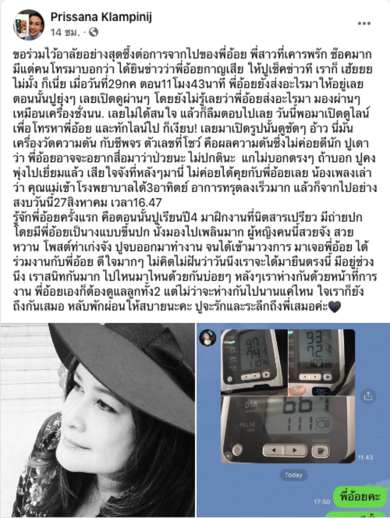 มีอยู่ช่วงนึงเราสนิทกันมาก ไปไหนมาไหนด้วยกันบ่อยๆ หลังๆ เราห่างกันด้วยหน้าที่การงาน พี่อ้อยเองก็ต้องดูแลลูกทั้ง 2 แต่ไม่ว่าจะห่างกันไปนานแค่ไหน ใจเราก็ยังถึงกันเสมอ หลับพักผ่อนให้สบายนะคะ ปูจะรักและระลึกถึงพี่เสมอค่ะ".