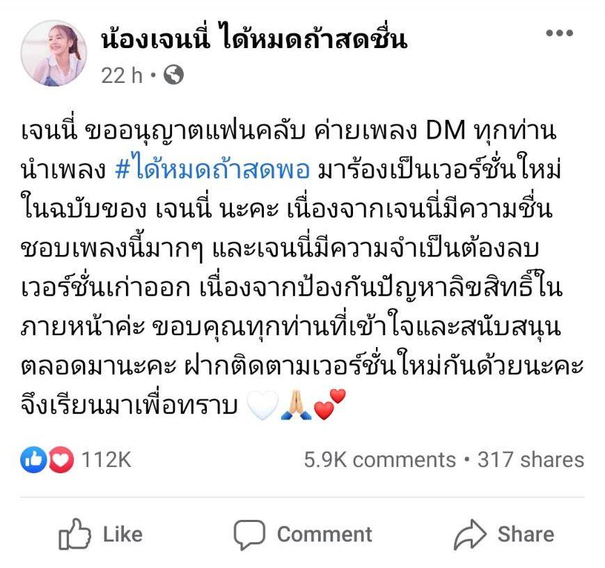 ล่าสุด เจนนี่ ได้หมดถ้าสดชื่น ประกาศขอลบเพลง “ได้หมดถ้าสดพอ” เวอร์ชั่นที่อั๋น ปาลิตา ร้องไว้ และจะร้องใหม่ในแบบเวอร์ชั่นตนเอง เพื่อป้องกันปัญหาลิขสิทธิ์ โดยบอกว่า “เจนนี่ ขออนุญาตแฟนคลับ ค่ายเพลง DM ทุกท่าน นำเพลง #ได้หมดถ้าสดพอ มาร้องเป็นเวอร์ชั่นใหม่ในฉบับของ เจนนี่ นะคะ เนื่องจากเจนนี่มีความชื่นชอบเพลงนี้มากๆ และเจนนี่มีความจำเป็นต้องลบเวอร์ชั่นเก่าออก เนื่องจากป้องกันปัญหาลิขสิทธิ์ในภายหน้าค่ะ ขอบคุณทุกท่านที่เข้าใจและสนับสนุนตลอดมานะคะ ฝากติดตามเวอร์ชั่นใหม่กันด้วยนะคะ จึงเรียนมาเพื่อทราบ”