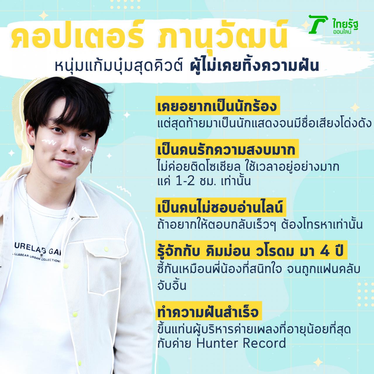 จากเด็กหนุ่มผู้มีความฝันอยากเป็นนักร้อง แต่สุดท้ายจับพลัดจับผลูได้มาเล่นซีรีส์จนมีชื่อเสียงโด่งดังและมีแฟนคลับเป็นที่รู้จักกันทั่วเอเชีย สำหรับ คอปเตอร์ ภานุวัฒน์ เกิดทองทวี วัย 23 ปี หรือที่รู้จักกันในชื่อของ คอปเตอร์ SBFIVE หนึ่งหนุ่มในสมาชิกวงบอยแบนด์ชื่อดัง ที่เขามีตำแหน่งเป็น แร็ป ของวง