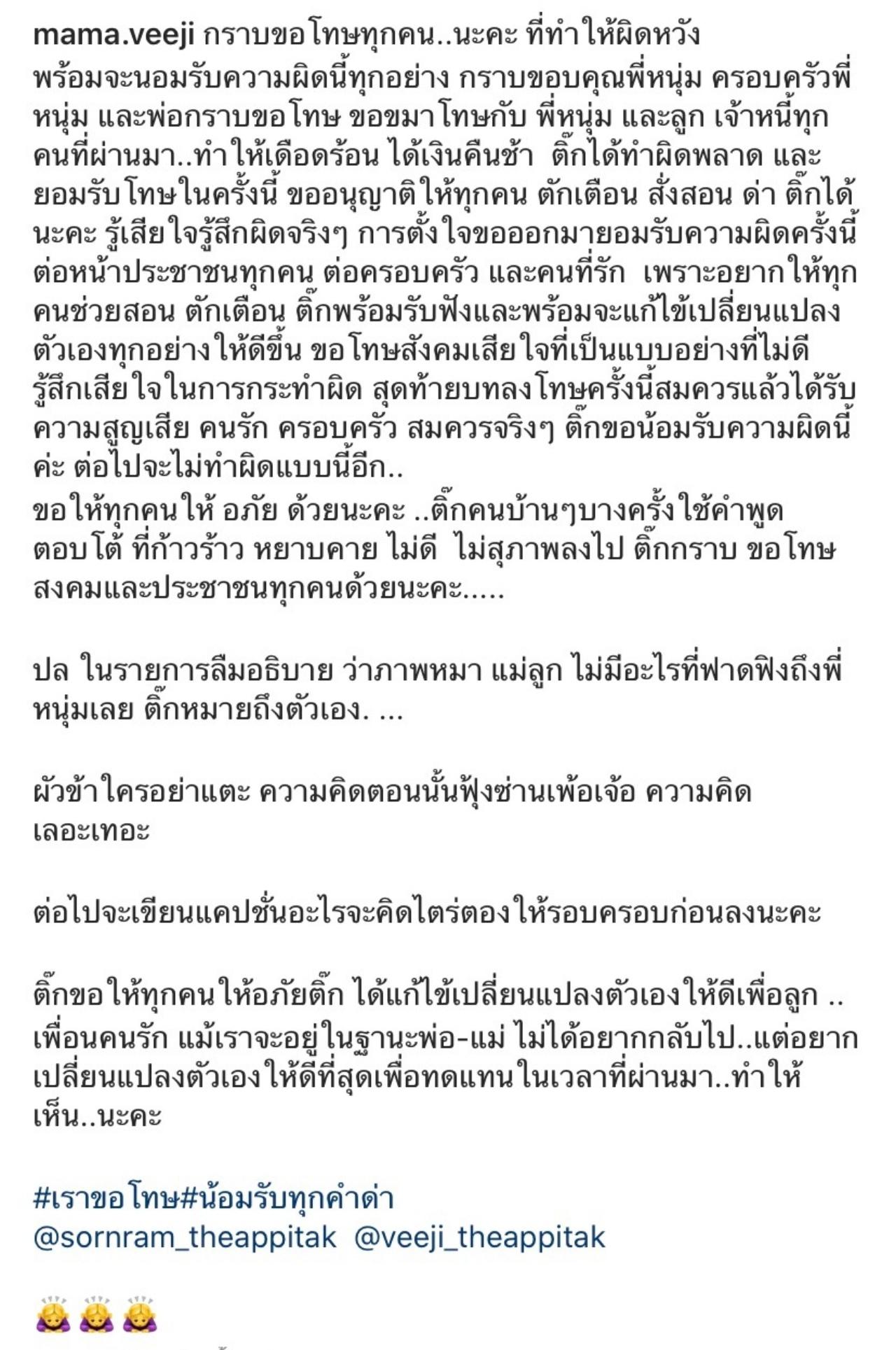 “กราบขอโทษทุกคน..นะคะ ที่ทำให้ผิดหวัง พร้อมจะน้อมรับความผิดนี้ทุกอย่าง กราบขอบคุณพี่หนุ่ม ครอบครัวพี่หนุ่ม และพ่อ กราบขอโทษ ขอขมาโทษกับ พี่หนุ่ม และลูก เจ้าหนี้ทุกคนที่ผ่านมา..ทำให้เดือดร้อน ได้เงินคืนช้า