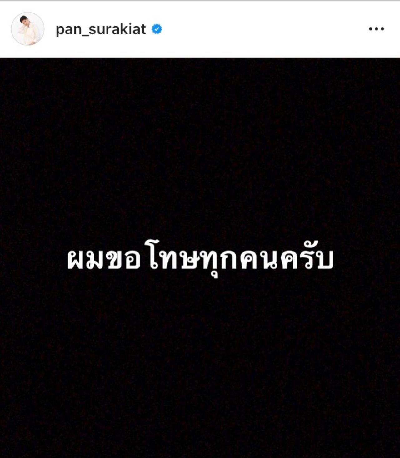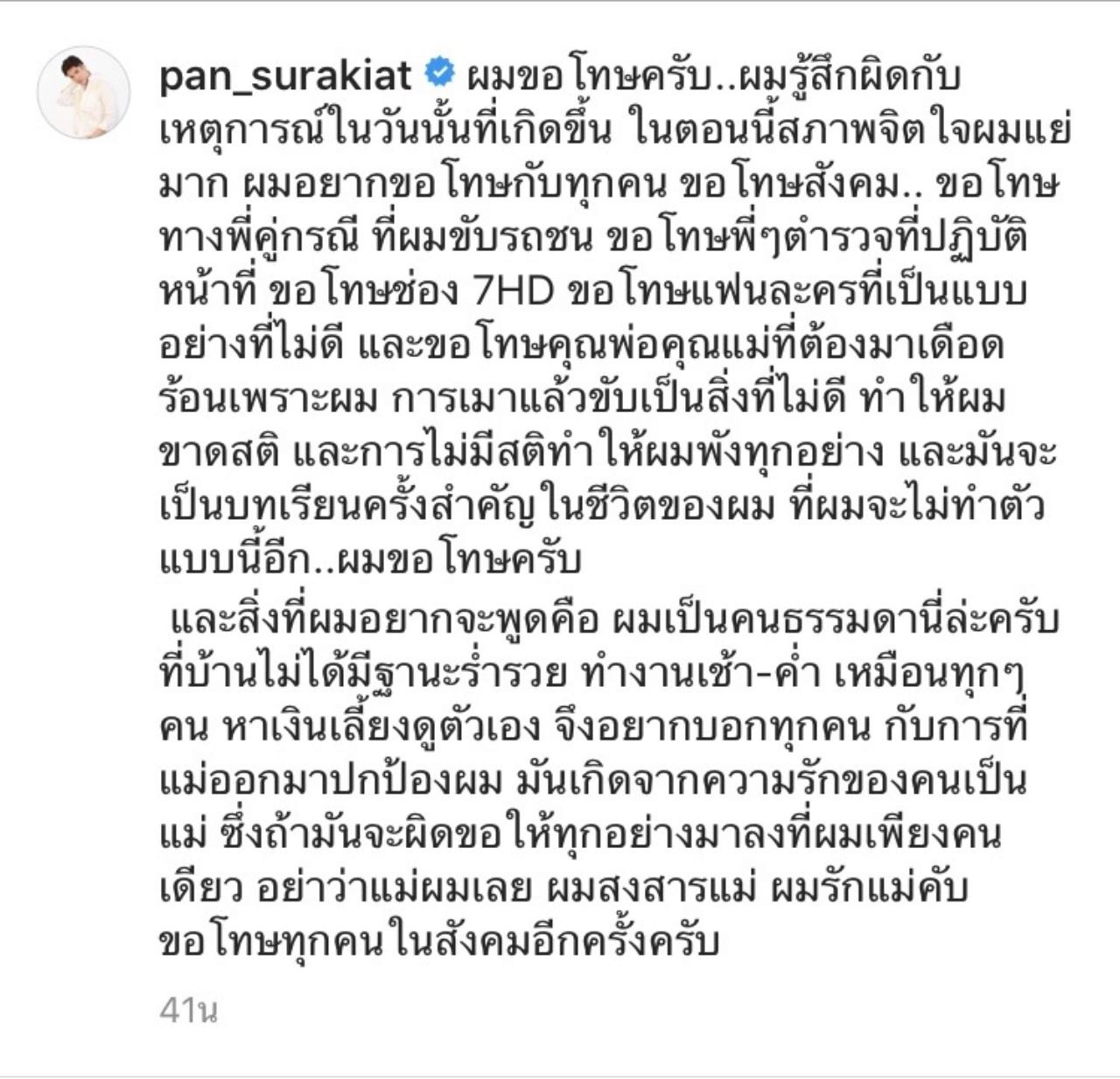 ล่าสุด แพน สุรเกียรติ ก็ได้โพสต์ข้อความผ่านทางอินสตาแกรม ขอโทษกับเรื่องราวที่เกิดขึ้น ยอมรับเมาแล้วขับเป็นสิ่งที่ไม่ดี และทำให้ขาดสติ พร้อมกับวอนอย่าด่าพ่อกับแม่เลย