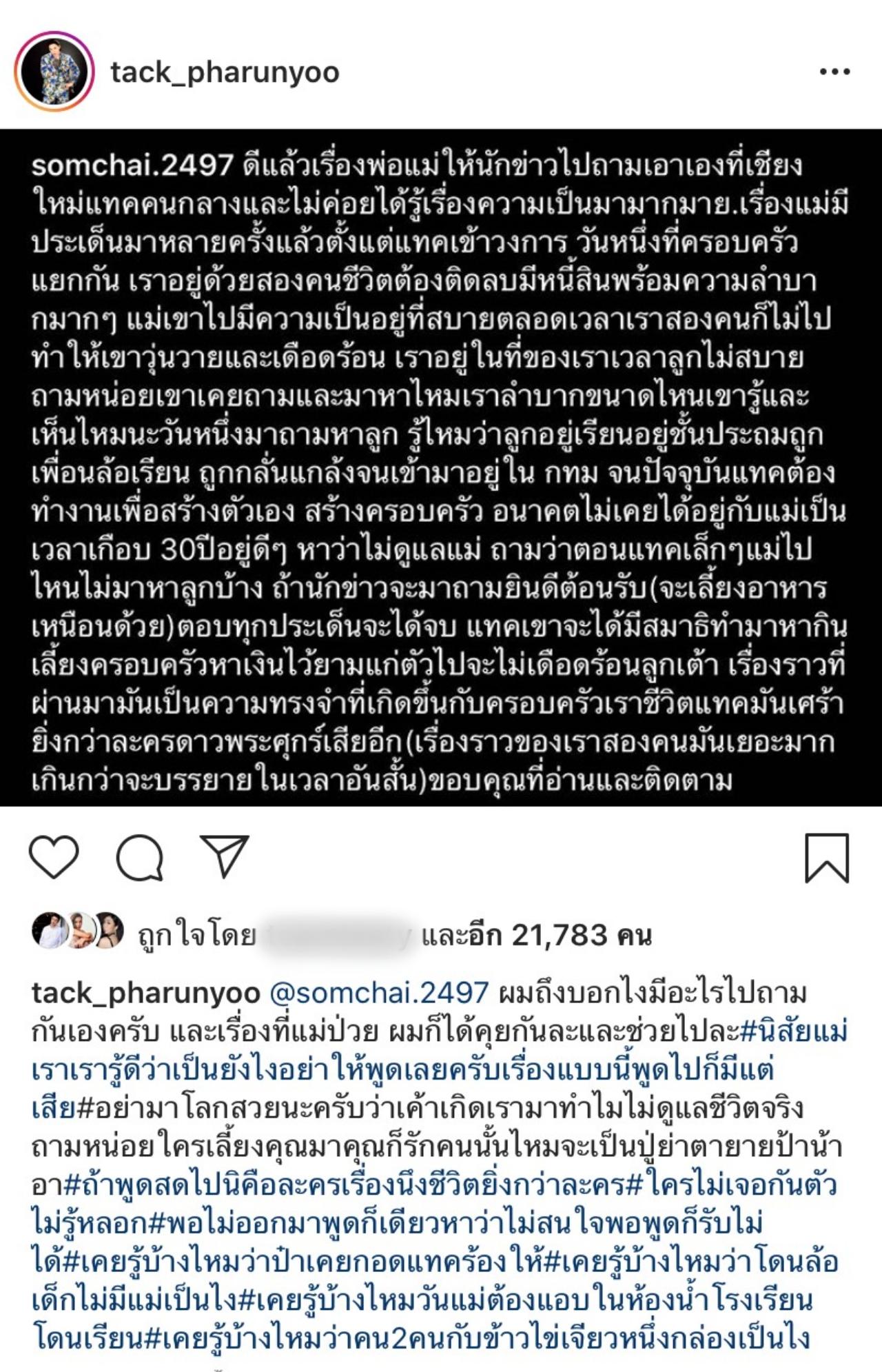 ซึ่งทางหนุ่ม แทค ภรัณยู ก็ได้โพสต์ข้อความที่คุณพ่อได้เขียน พร้อมกับเขียนแคปชั่นบอกเล่าความรู้สึกของตัวเองหลังจากที่ถูกถามถึงเรื่องแม่และคนต่อว่าว่าไม่สนใจดูแลผู้มีพระคุณว่า