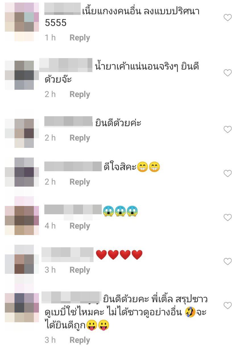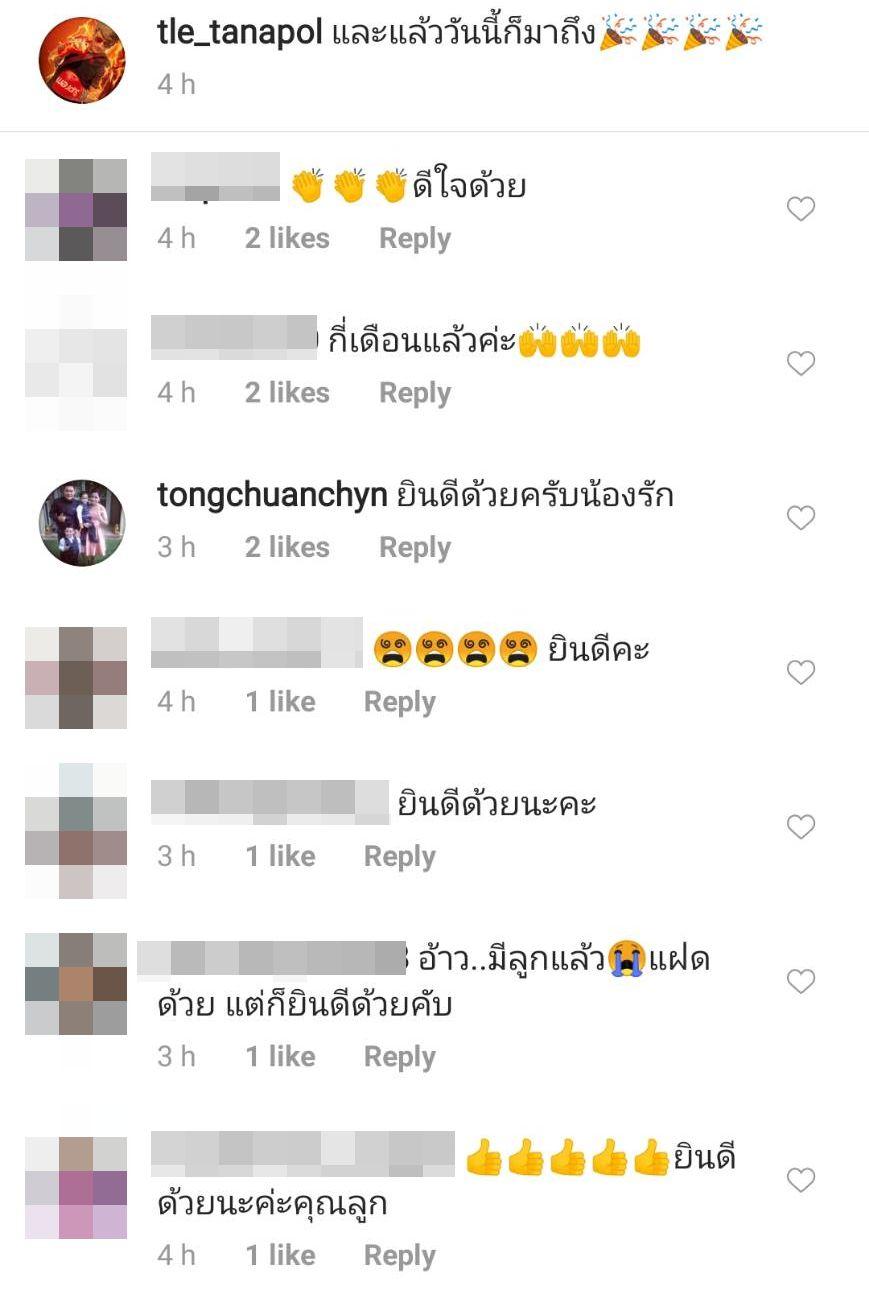 ซึ่งคอมเมนต์ต่างๆ มีทั้งแสดงความยินดี บ้างก็ถามว่ากี่เดือนแล้ว บางคนก็ทักว่าเป็นลูกแฝดด้วย และมีคนที่ถามว่าสรุปซาวนด์ดูเบบี๋ใช่ไหมจะได้ยินดีถูก และมีบางคนแซวว่าแกงคนอื่น ลงแบบปริศนา ฯลฯ ด้าน ต๋อง ชวนชื่น ก็คอมเมนต์ว่า “ยินดีด้วยครับน้องรัก”