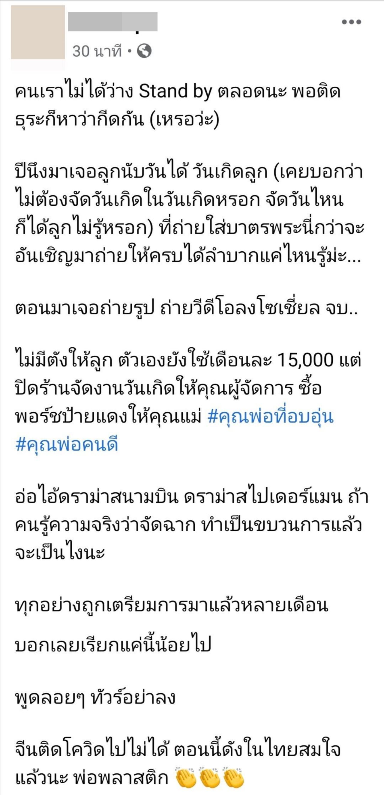"คนเราไม่ได้ว่าง Stand by ตลอดนะ พอติดธุระก็หาว่ากีดกัน (เหรอวะ) ปีนึงมาเจอลูกนับวันได้ วันเกิดลูก (เคยบอกว่าไม่ต้องจัดวันเกิดในวันเกิดหรอก จัดวันไหนก็ได้ลูกไม่รู้หรอก) ที่ถ่ายใส่บาตรพระนี่กว่าจะอัญเชิญมาถ่ายให้ครบได้ลำบากแค่ไหนรู้มะ...ตอนมาเจอถ่ายรูป ถ่ายวิดีโอลงโซเชียล จบ..