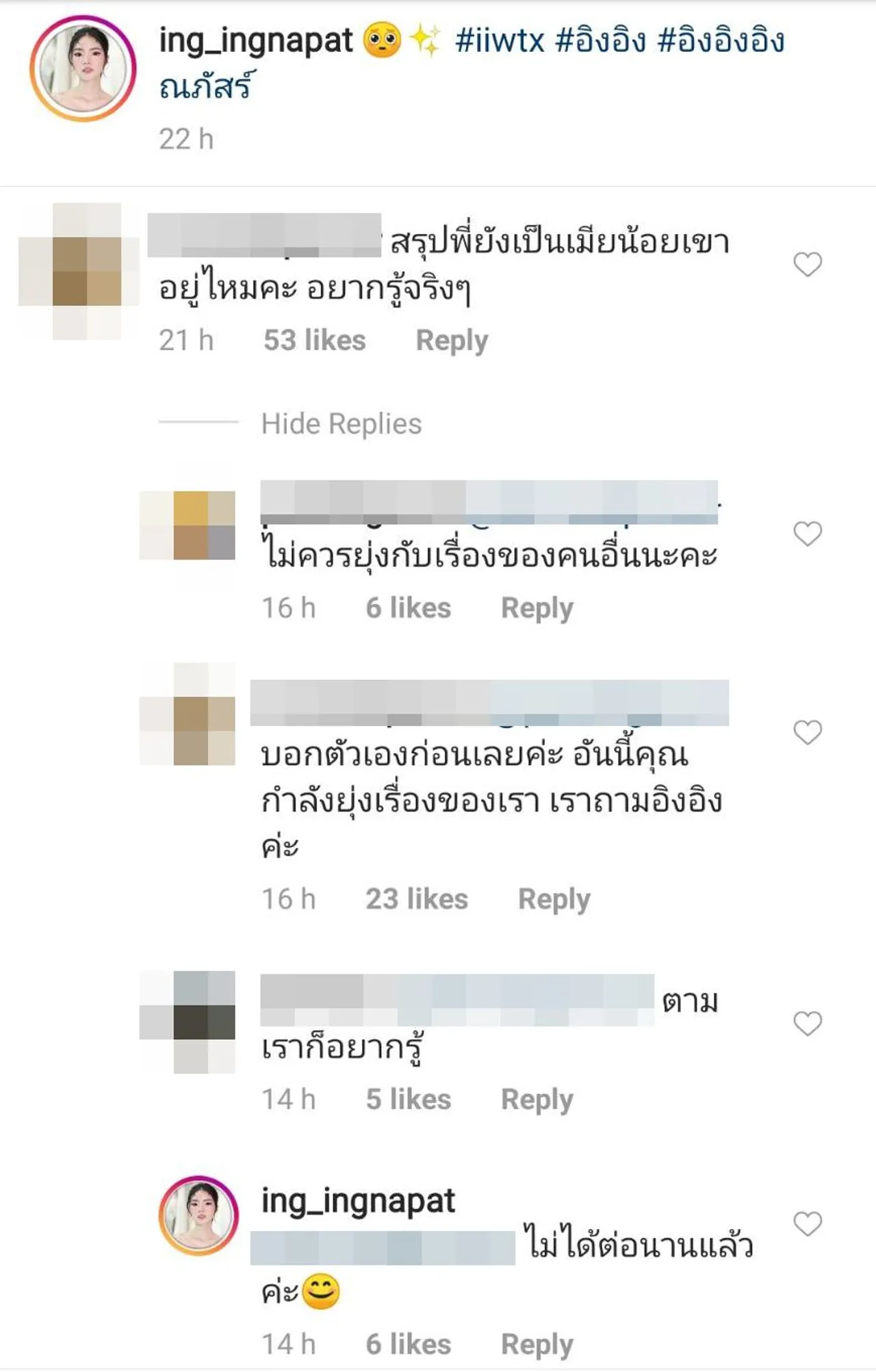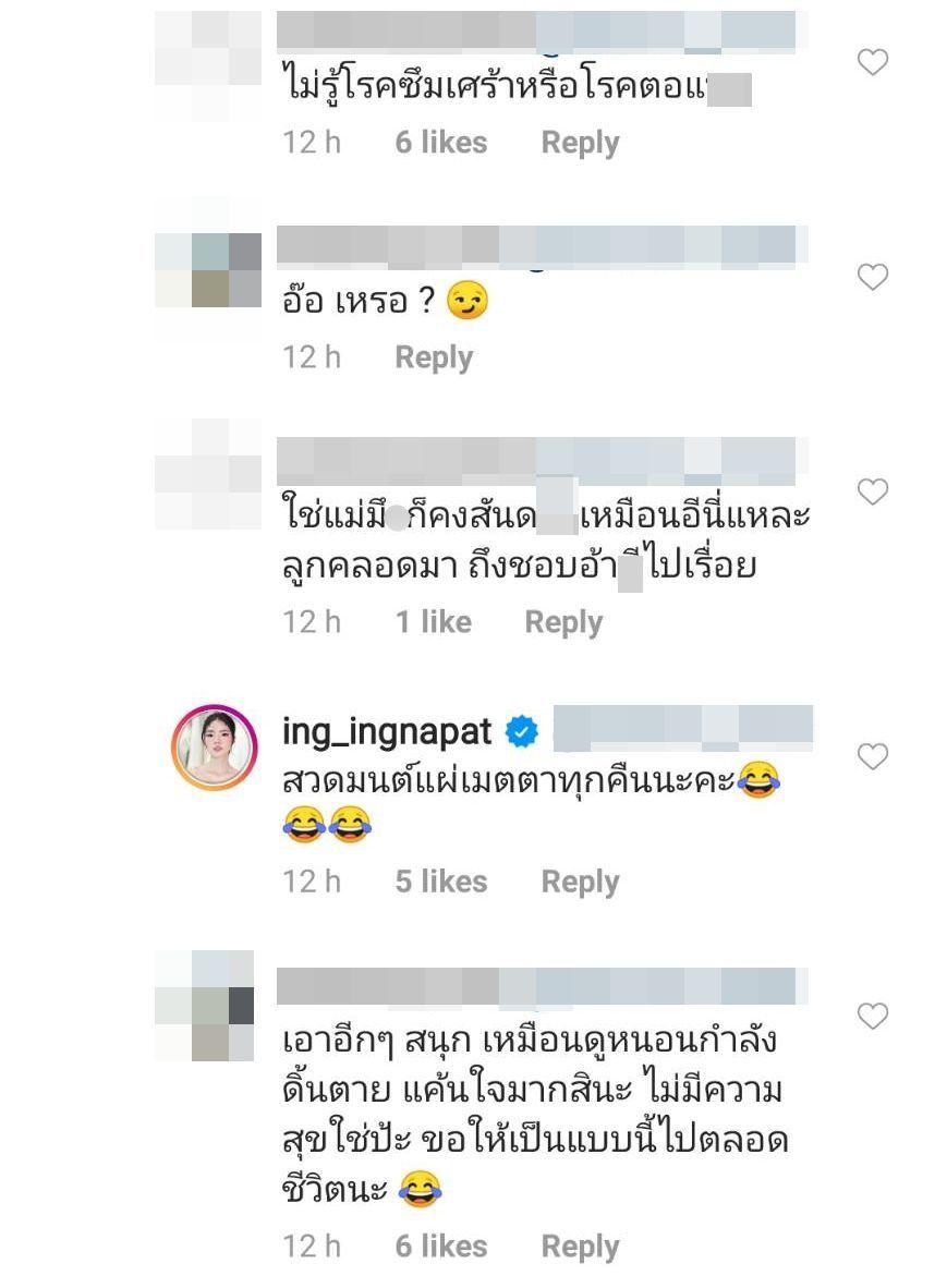 แต่หลังจากนั้นก็ยังคงมีคนที่เข้ามาคอมเมนต์ด้วยคำพูดหยาบคาย และมีชาวเน็ตบางคนเข้ามาตอบโต้แทนอิงอิงจนไอจีเดือด และอิงอิงตอบคอมเมนต์คนที่เข้ามาปกป้องว่า “สวดมนต์แผ่เมตตาทุกคืนนะคะ” ด้วย.