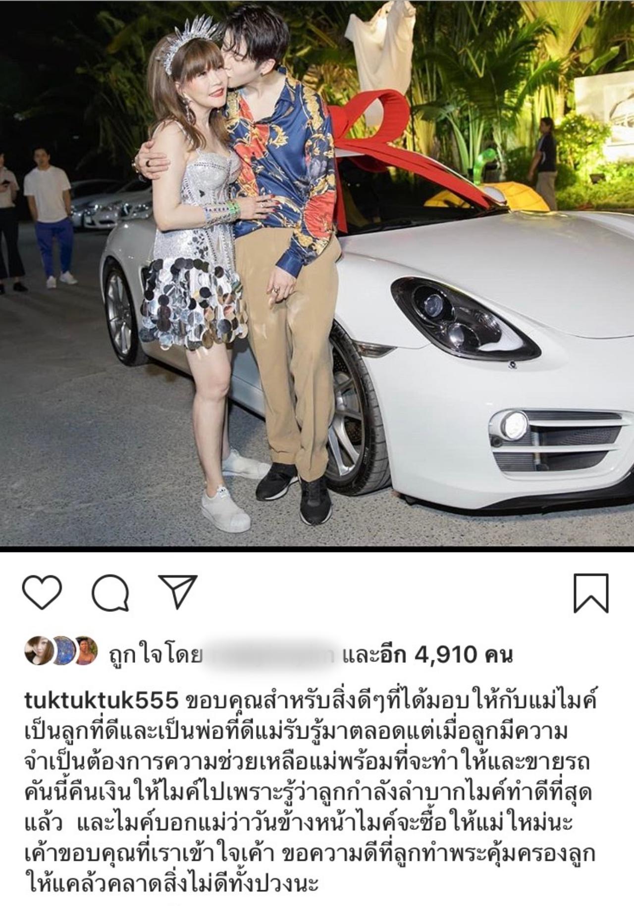 “ขอบคุณสำหรับสิ่งดีๆ ที่ได้มอบให้กับแม่ ไมค์เป็นลูกที่ดีและเป็นพ่อที่ดีแม่รับรู้มาตลอดแต่เมื่อลูกมีความจำเป็นต้องการความช่วยเหลือแม่พร้อมที่จะทำให้และขายรถคันนี้คืนเงินให้ไมค์ไปเพราะรู้ว่าลูกกำลังลำบาก ไมค์ทำดีที่สุดแล้ว และไมค์บอกแม่ว่าวันข้างหน้าไมค์จะซื้อให้แม่ใหม่นะ เค้าขอบคุณที่เราเข้าใจเค้า ขอความดีที่ลูกทำพระคุ้มครองลูกให้แคล้วคลาดสิ่งไม่ดีทั้งปวงนะ”