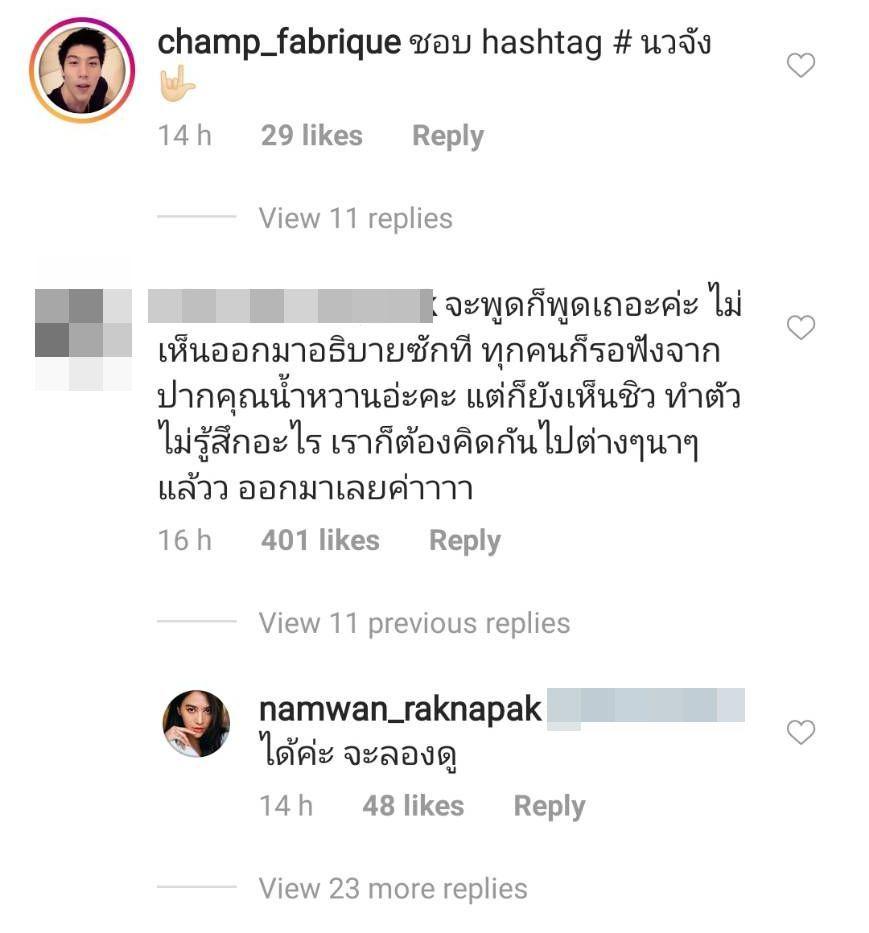 ซึ่งหลังจากน้ำหวานโพสต์ภาพข้อความดังกล่าวก็มีชาวเน็ตเข้ามาแสดงความคิดเห็นเป็นจำนวนมาก ด้านไฮโซแชมป์ก็เข้ามาคอมเมนต์ว่า “ชอบ hashtag # นวจัง” แต่หลังจากนั้นก็มีชาวเน็ตบางคนเข้ามาวิจารณ์ และเกิดการโต้เถียงกันไปมาระหว่างชาวเน็ตด้วย.