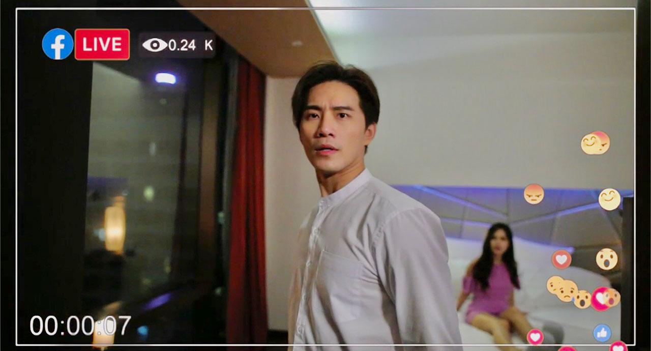 หนุ่มบี้ จะรู้สึกยังไงกันไปฟังกัน “ถ้าในชีวิตจริงคงไม่มีเรื่องแบบนี้เกิดขึ้นแน่นอนครับ เพราะผมเป็นคนที่รักครอบครัวมาก (ยิ้ม) แต่ในฉากนี้เป็นฉากในละครที่ถูก กระติ๊บ ที่เขาเป็นภรรยาเราในเรื่องนี้มาแฉเรากันแบบไลฟ์สด คือ บอกเลยว่ายุคนี้เทคโนโลยีน่ากลัวมาก เพราะทุกคนอยู่ในโลกของออนไลน์ ทุกคนเล่นโทรศัพท์มือถือ ใครที่ทำอะไรผิด หรือไม่ถูกทำนองคลองธรรม ต้องคิดให้ดีก่อนที่จะทำด้วยนะครับ”