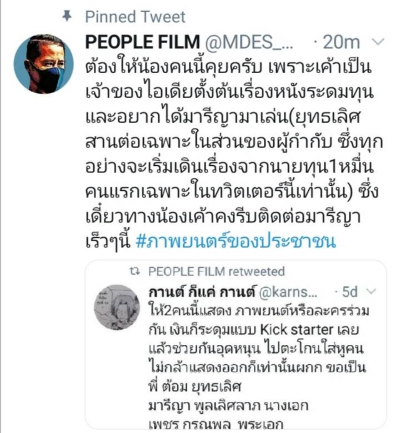 มารีญา ได้ทวีตบอกเลยว่า "ขอชี้แจงเรื่อง #ภาพยนตร์ของประชาชน ที่ประกาศระดมทุนอยู่ตอนนี้นะคะ ว่ามารีญายังไม่ได้รับการติดต่อ และทาบทามให้แสดงหนังเรื่องนี้ ขอให้ทุกคนพิจารณาและอ่านรายละเอียดให้ดี ก่อนตัดสินใจสมทบทุนนะคะ"