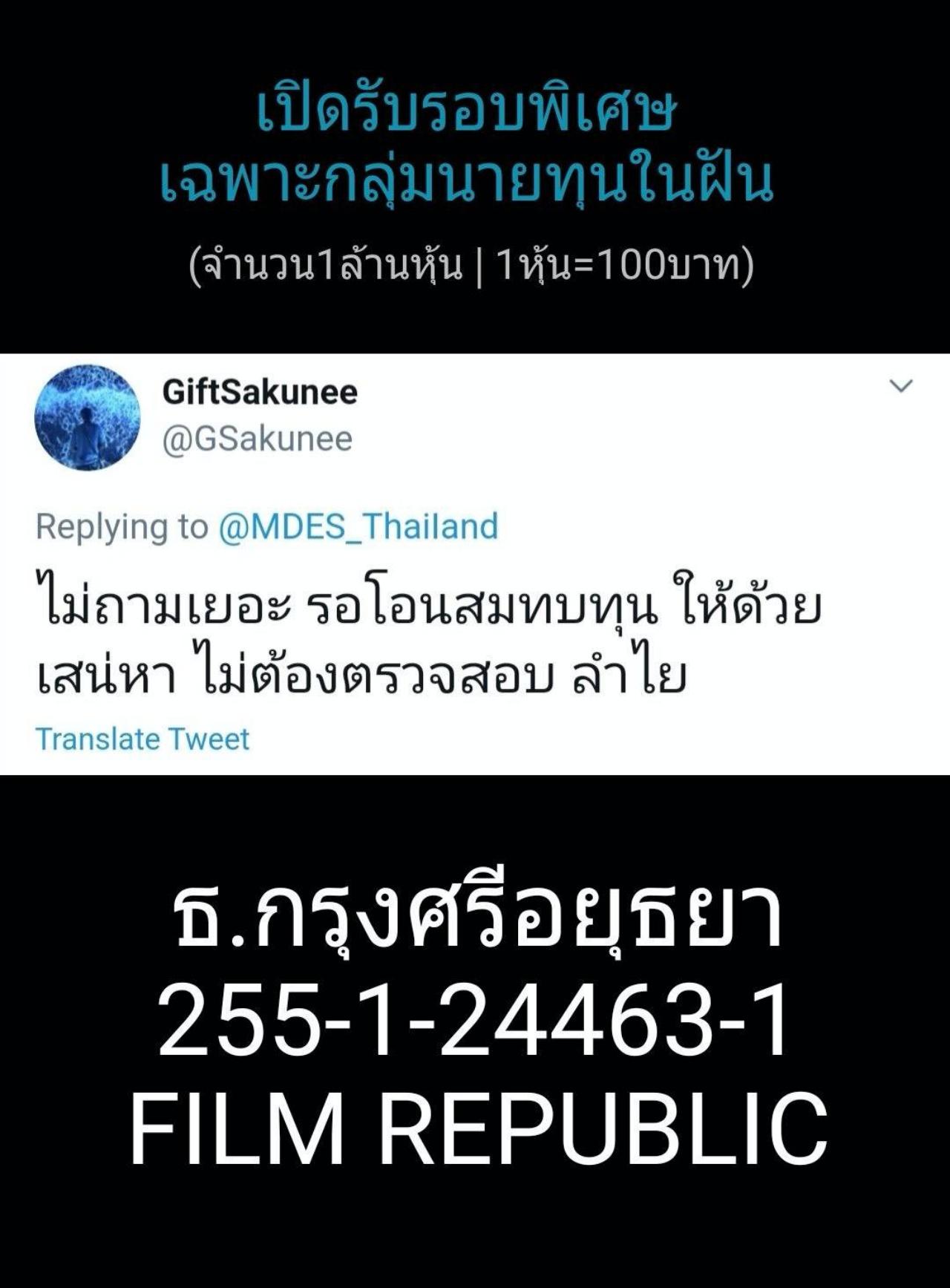 "นี่อาจจะไม่ใช่เข้าใจผิด แต่อาจเป็นเพราะมารีญาคงไม่รู้จักเรา เค้าก็เลยเป็นห่วงเรื่องการโอนเงินกลัวถูกโกงมากกว่า พวกทรายกะแอมมีรู้จักกัน เลยไม่สนใจจะเอามาเป็นประเด็น ซึ่งจริงๆ แล้วทางเราตั้งใจว่า ถ้าเราหานายทุนได้หมื่นคนแรก เราถึงจะเริ่มทาบทามนักแสดง ซึ่งเราก็จะติดต่อน้องไปนะ เพราะจากทวิตเตอร์ตัวนั้นคนสนใจเยอะมาก ตอนนี้เรามีนายทุนแน่ๆ แล้วประมาณเกือบ 3 พันคน ครบหมื่นเมื่อไหร่ เราก็จะรีบดำเนินการทันที"