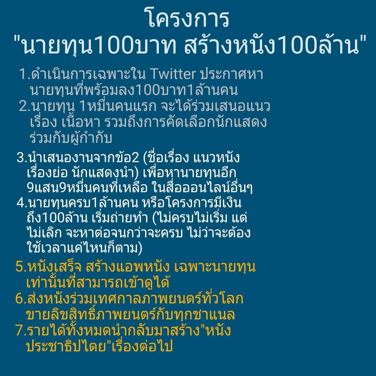 ถ้า ต้อม ยุทธเลิศ สามารถหานายทุนได้ถึงล้านคน หนังเรื่องนี้จะกลายเป็นหนังที่มีทุนสร้างถึง 100 ล้านบาท จากนายทุนที่เป็นประชาชนคนธรรมดา ลงเงินกันเพียงคนละ 100 บาท จะเป็นอีกหน้าหนึ่งของประวัติศาสตร์หนังไทยได้เลย เพราะปกตินายทุนที่สร้างหนัง ส่วนใหญ่จะเป็นกลุ่มทุนมหาเศรษฐีต่างๆ ไม่ใช่ประชาชนเป็นหลัก ที่ร่วมระดมทุนกันสร้างหนังเอง.